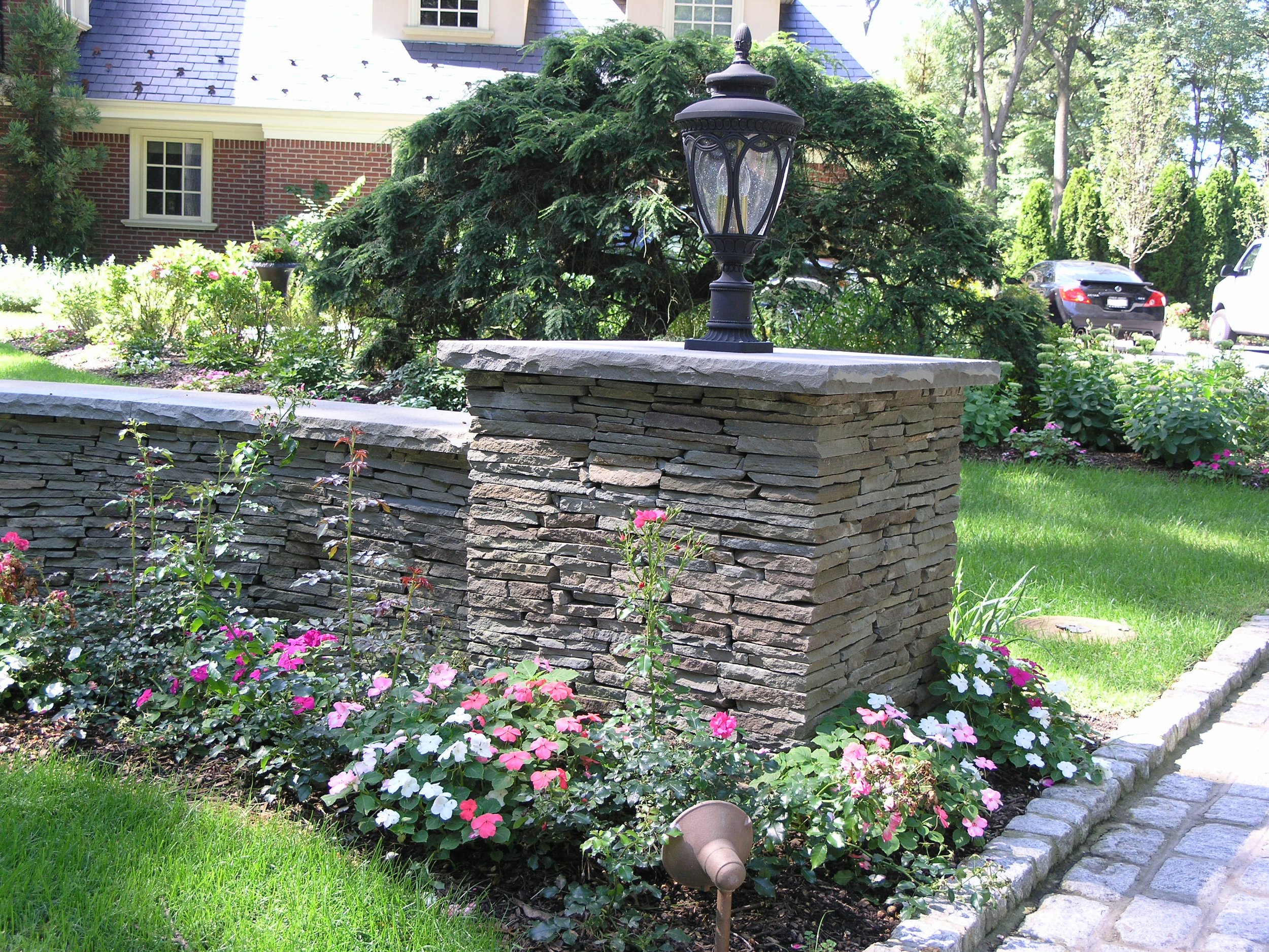 Starting with the true entry, consider flanking your driveway with custom stone retaining walls that guide guests toward your home with a sense of grandeur and permanence. Revamping your driveway with driveway pavers or a segmented design incorporating accent pavers can further elevate its visual impact. Enhance your entry landing with stone or brick steps that echo the curves of the retaining walls, creating a cohesive design that ties the entire entry area together beautifully. Consider adding a covered front landing with stone columns or traditional wood posts to enhance the architectural character of your home in Mt. Sinai, NY.