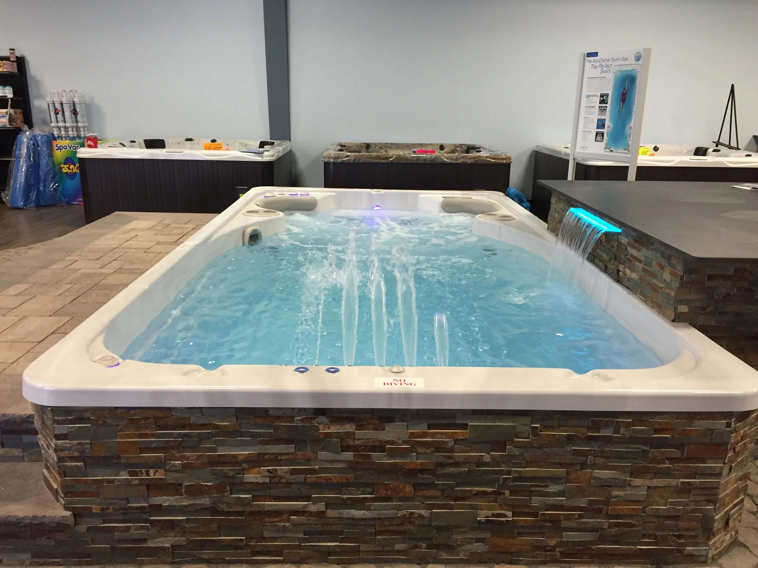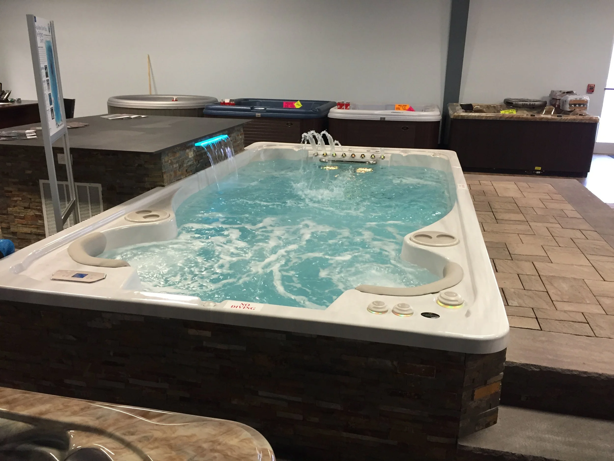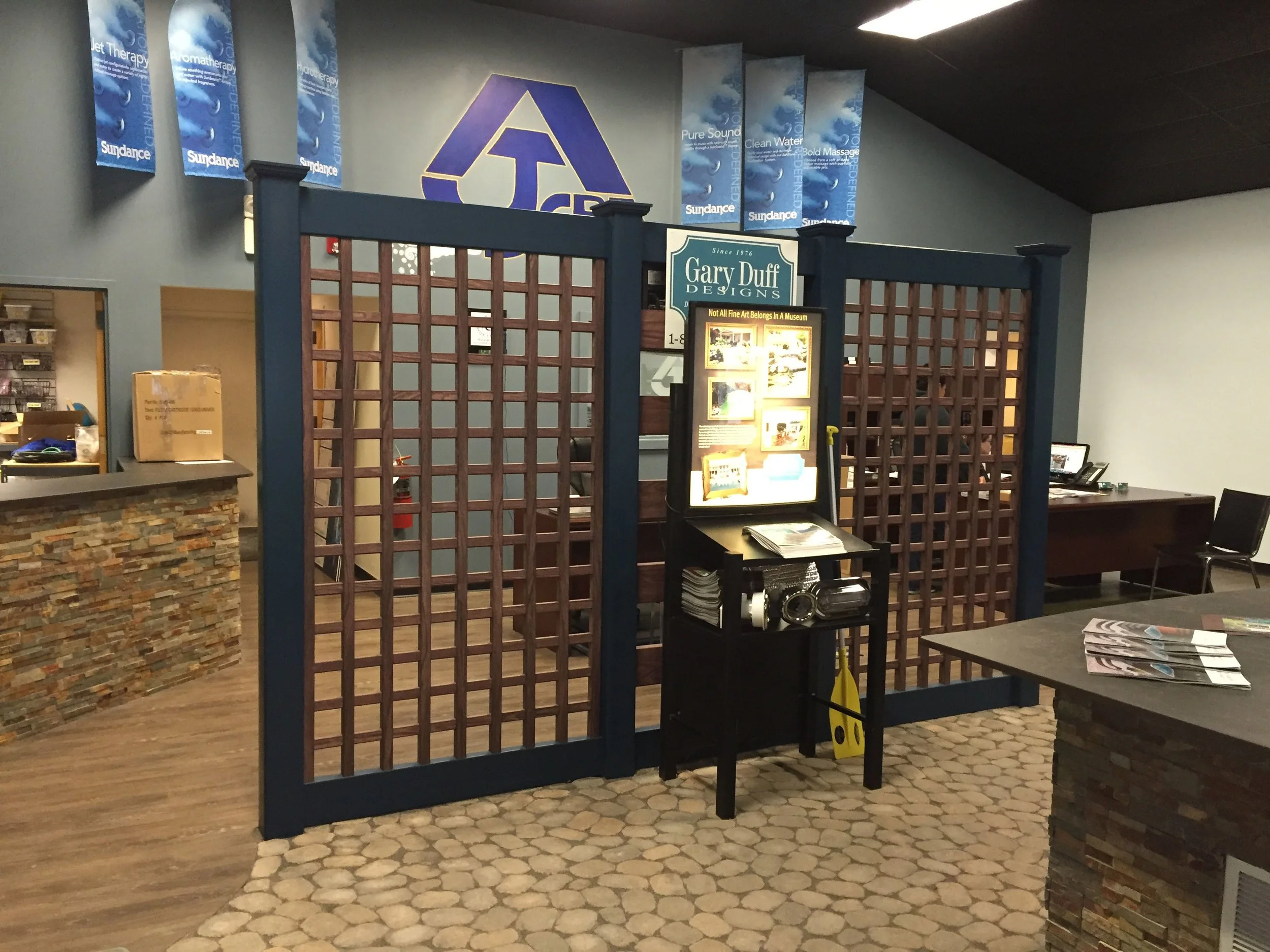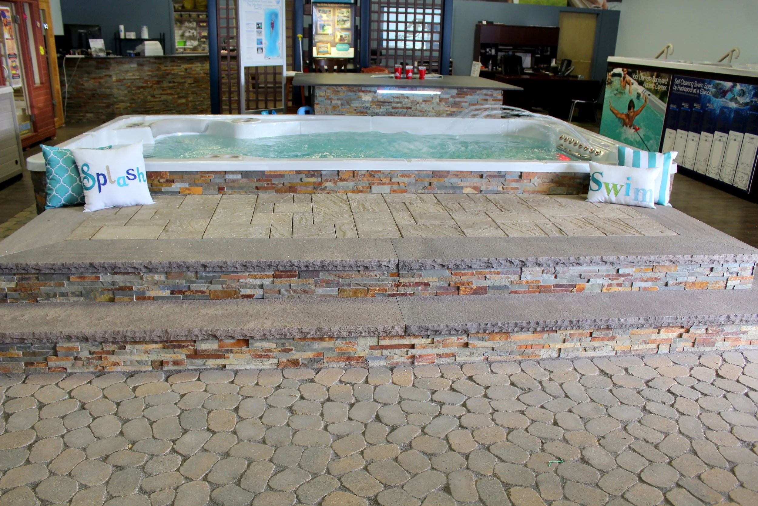 Gary Duff Designs created a whole new look and feel for those shopping for spas at AJ Spa & Hot Tubs. In just two weeks, this display was put together, along with a sheer descent waterfall into the swim spa off a raised bar in the back. The result: an entire sea-like living space, complete with concealing features that hide equipment and plumbing details.