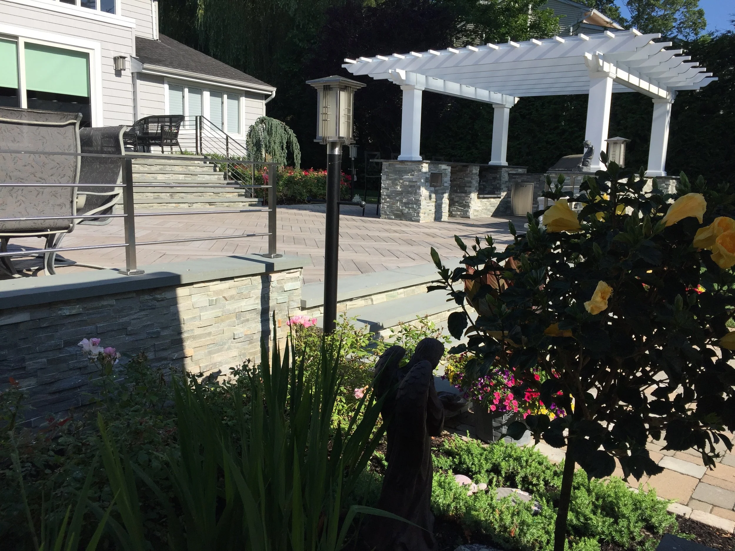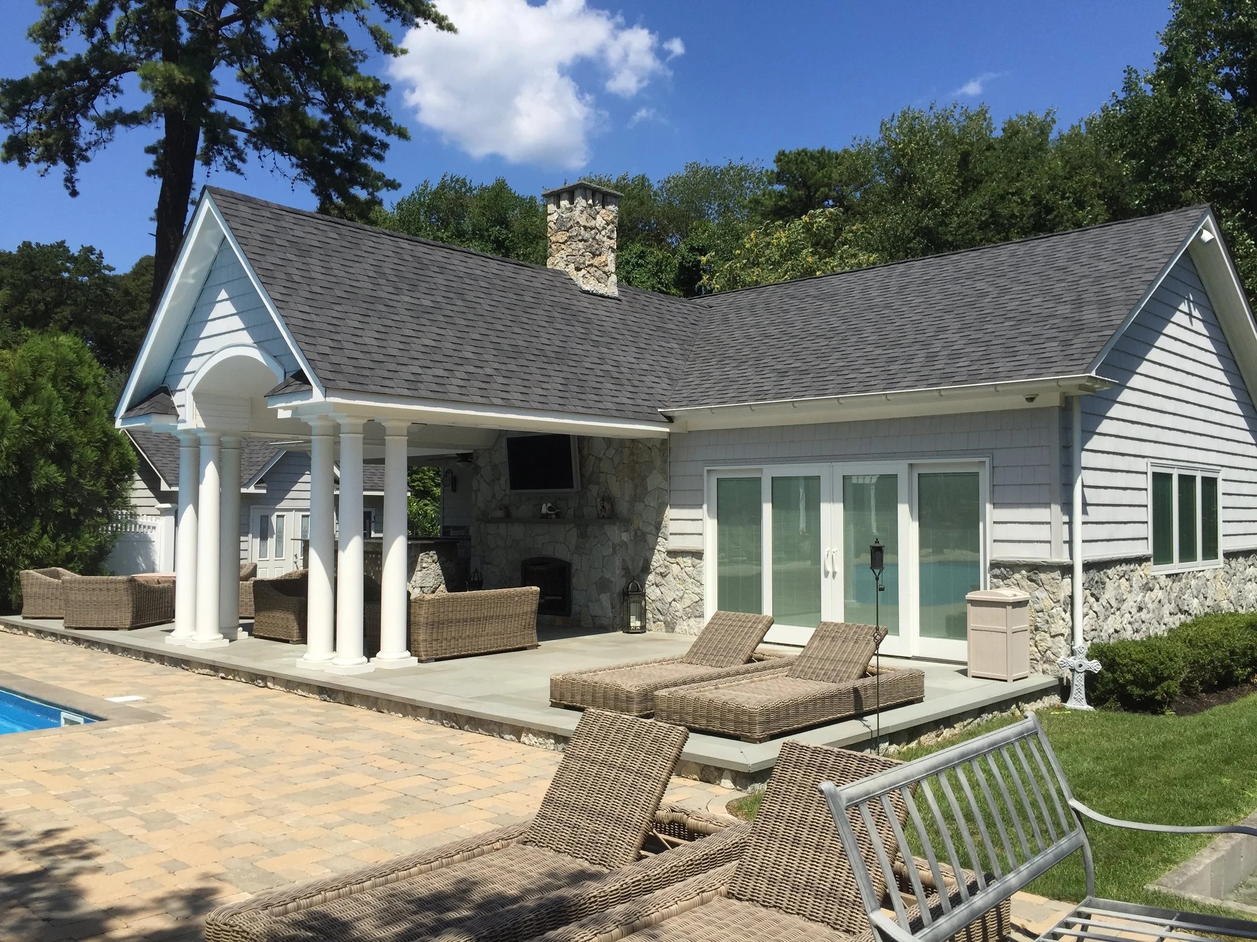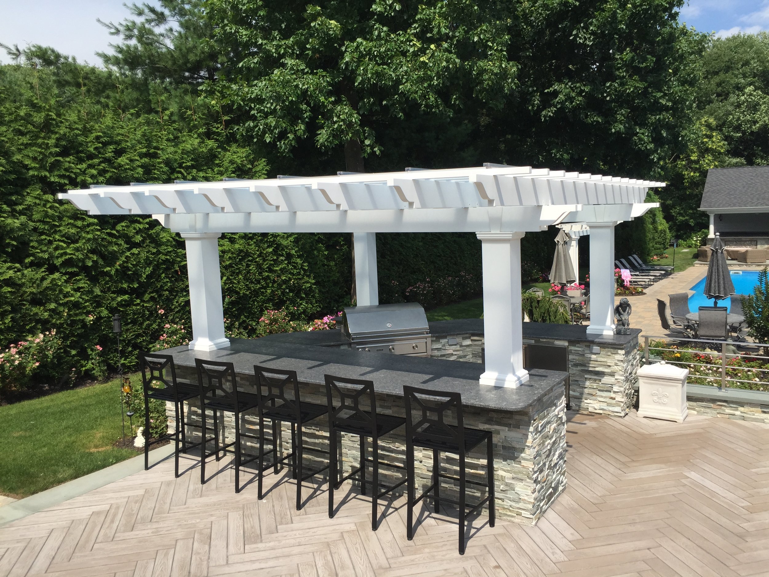A narrow, yet deep, property presents its own set of landscape challenges. By playing with the depth of the yard, Gary Duff Designs transformed the unusual layout into a space that felt wider, more expansive and more inviting. A new cabana, complete with bocce court, and a new spacious outdoor kitchen, complete with pergola and above shade structure, resulted in a plethora of fresh entertainment options. At the end of the project, the Smithtown homeowners were left with space that was much more a resort than residence.