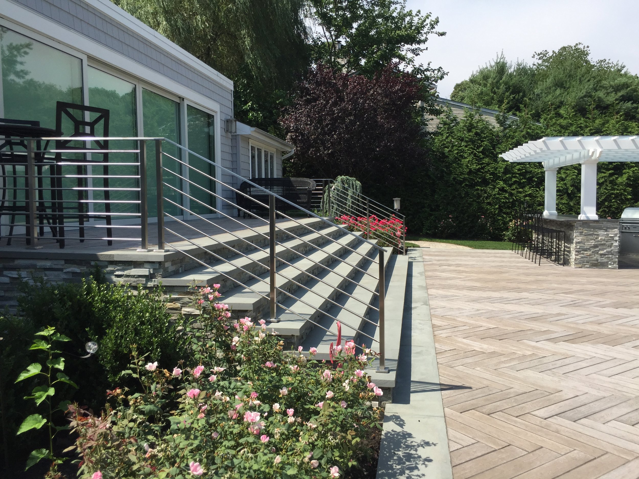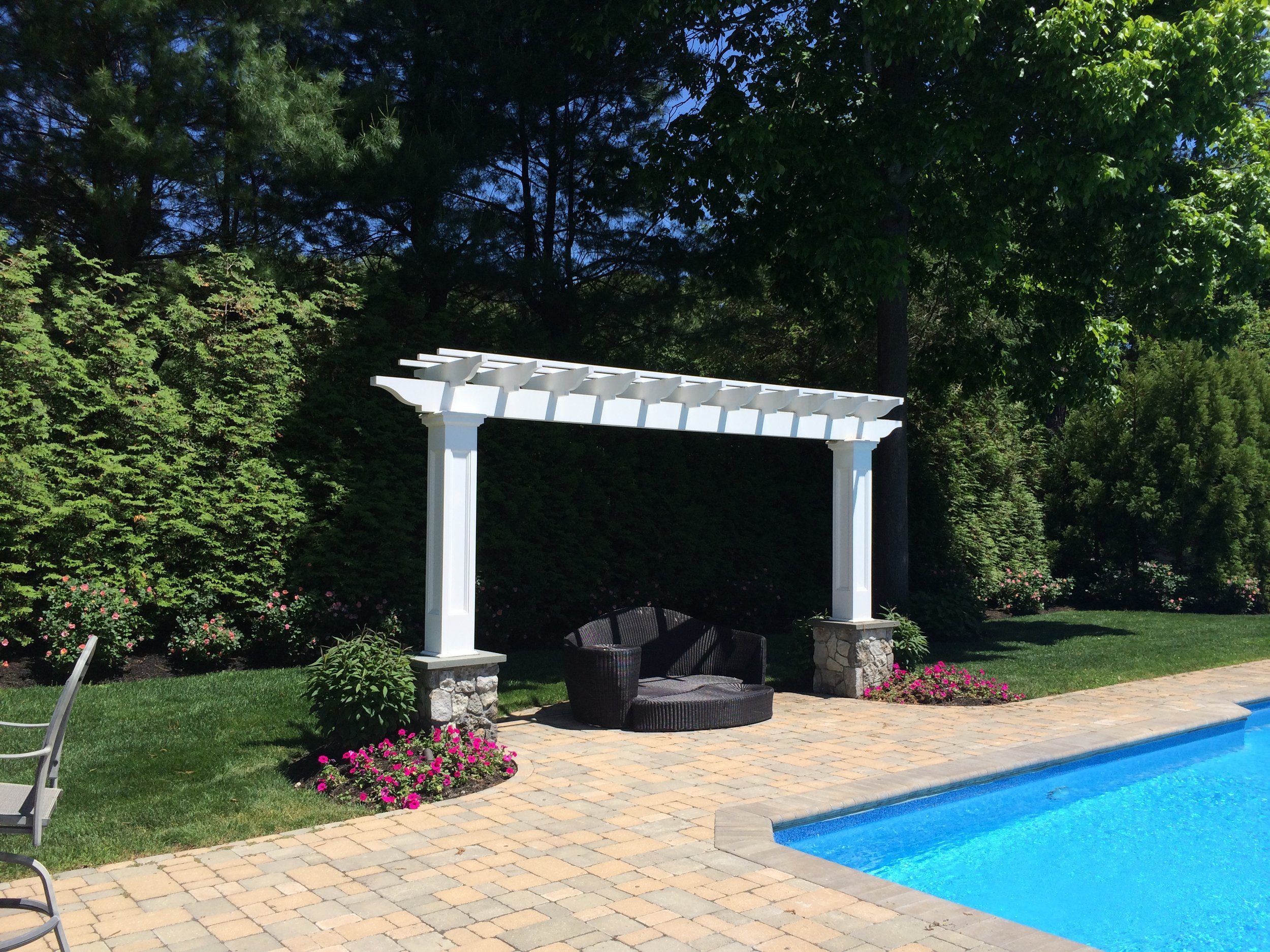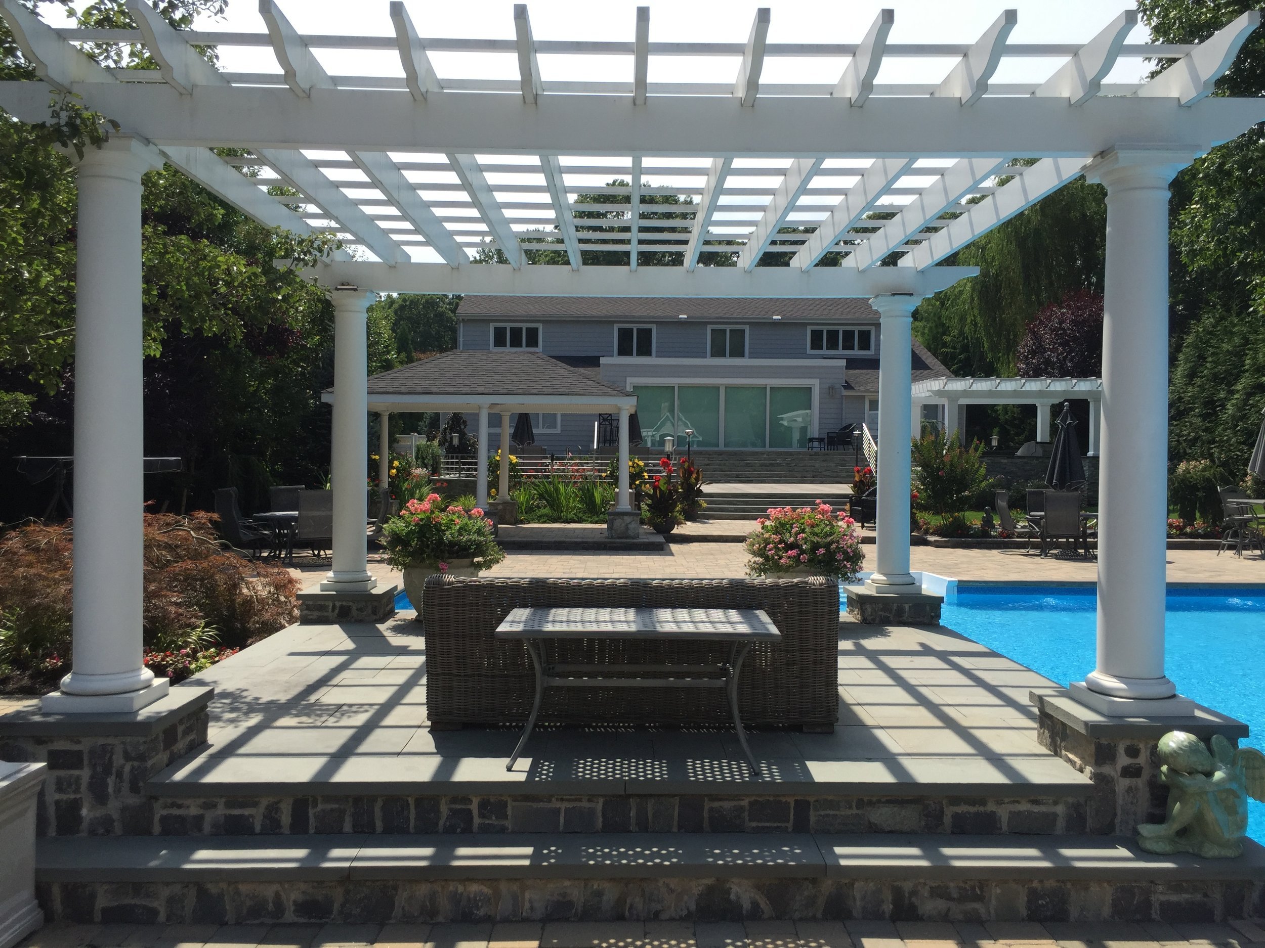 A narrow, yet deep, property presents its own set of landscape challenges. By playing with the depth of the yard, Gary Duff Designs transformed the unusual layout into a space that felt wider, more expansive and more inviting. A new cabana, complete with bocce court, and a new spacious outdoor kitchen, complete with pergola and above shade structure, resulted in a plethora of fresh entertainment options. At the end of the project, the Smithtown homeowners were left with space that was much more a resort than residence.