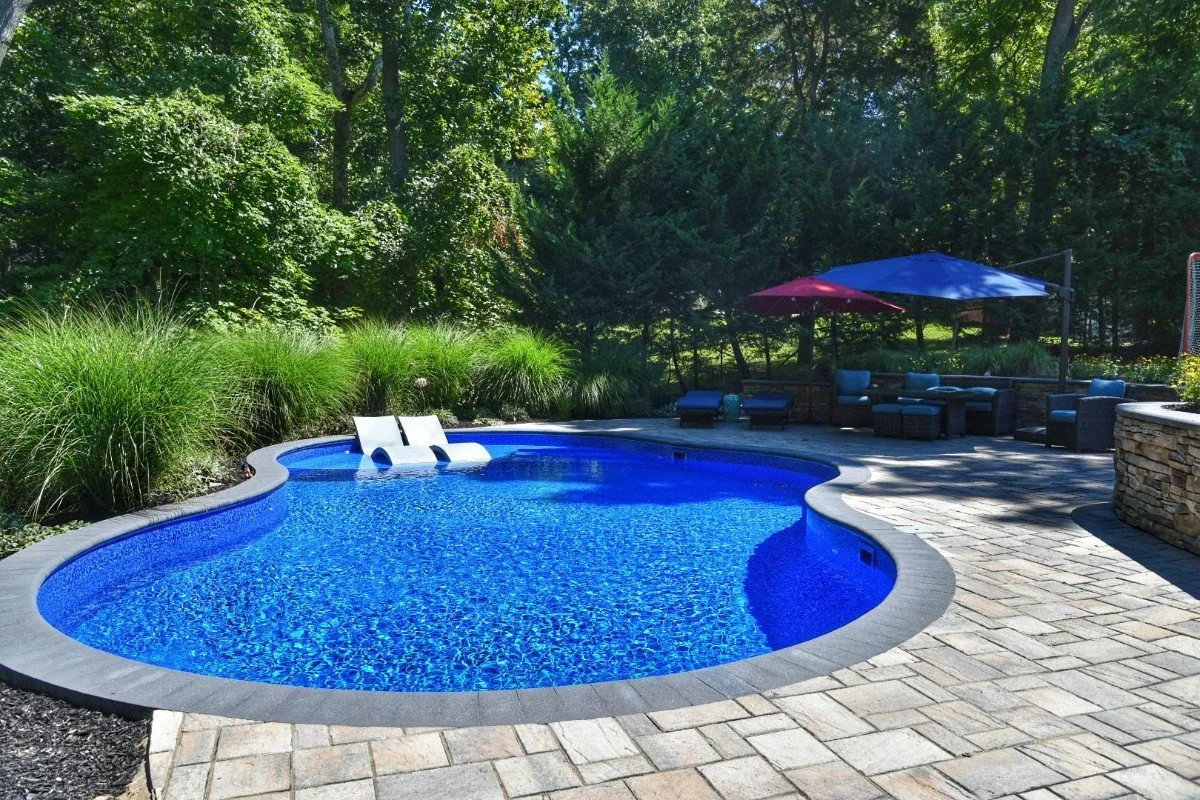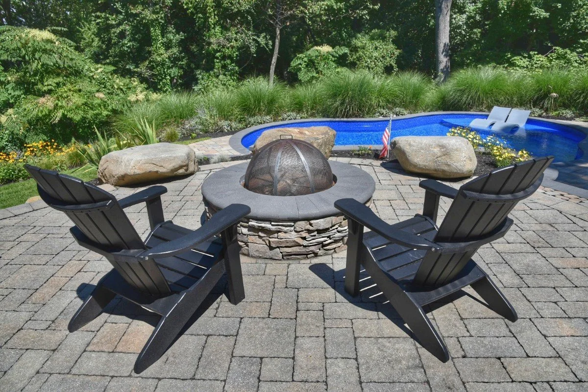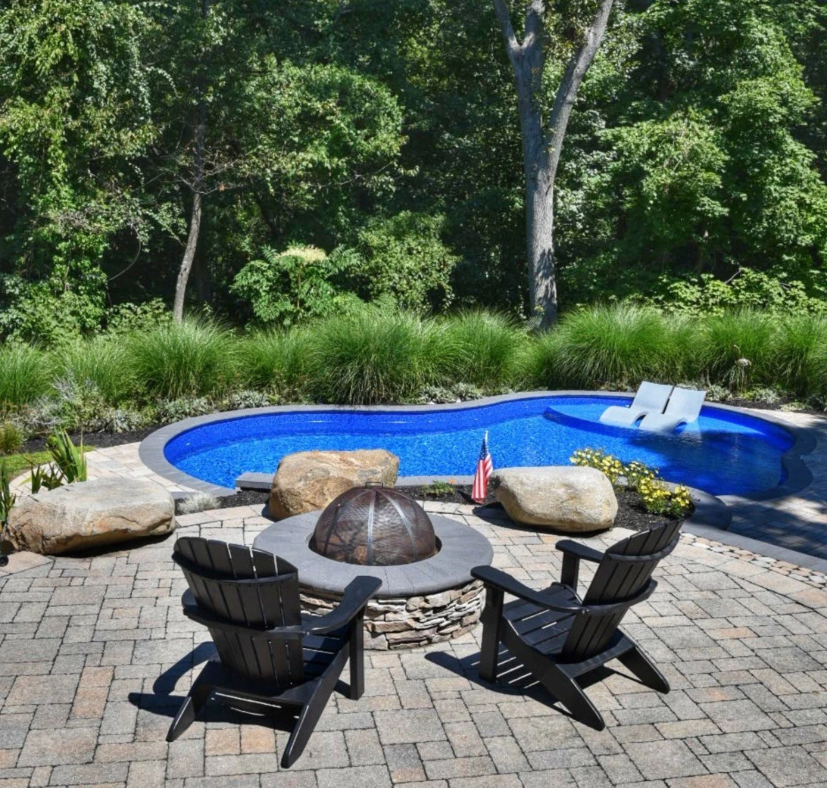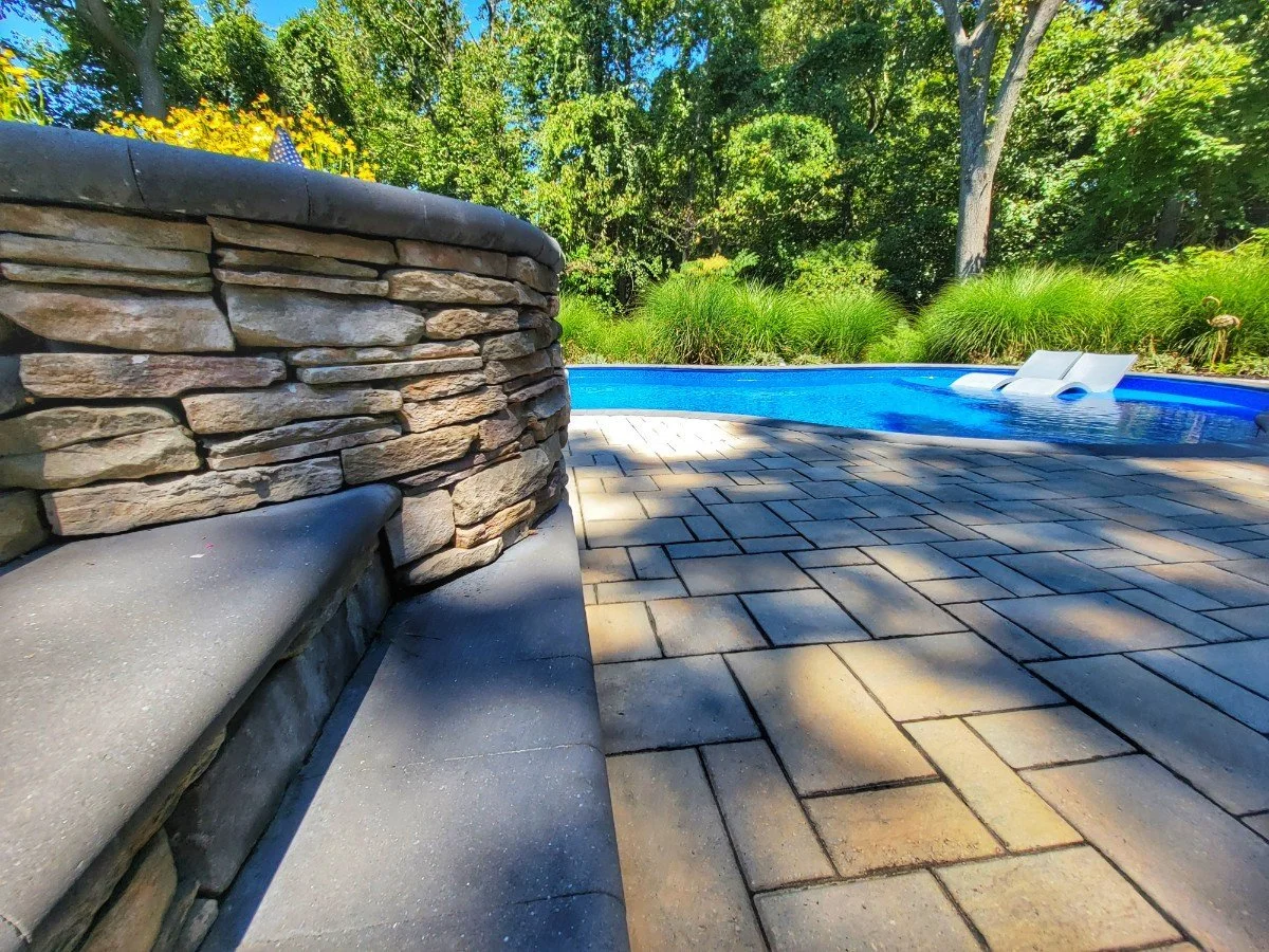 This full-landscape project included the front entrance beautification of this charming Dutch colonial home and a poolscape. Impressive natural stone veneer pillars with built-in outdoor lighting at the stairway entrance lead to the poolscape. Seating walls surround the inground pool on one side, while vibrantly green planting beds surround the other. The textured pool paver patio provides extra traction for slippery wet feet. After a swim, the raised patio area provides warmth and seating by a fire pit and a view of the pool.