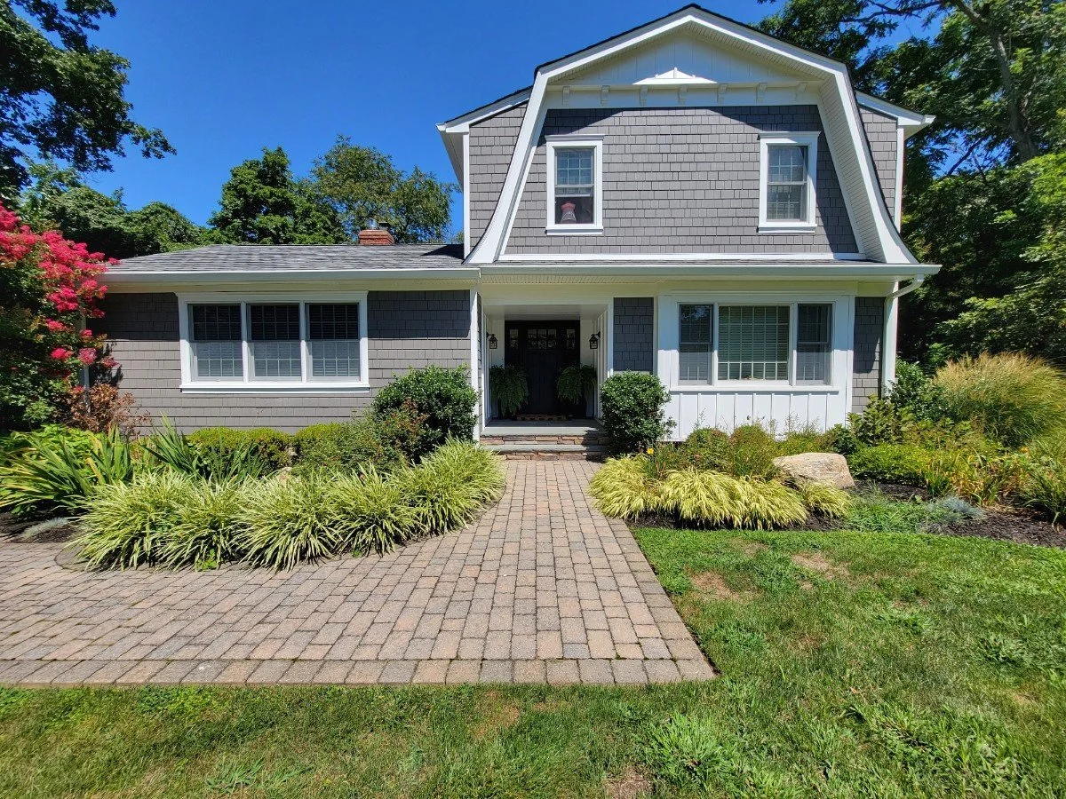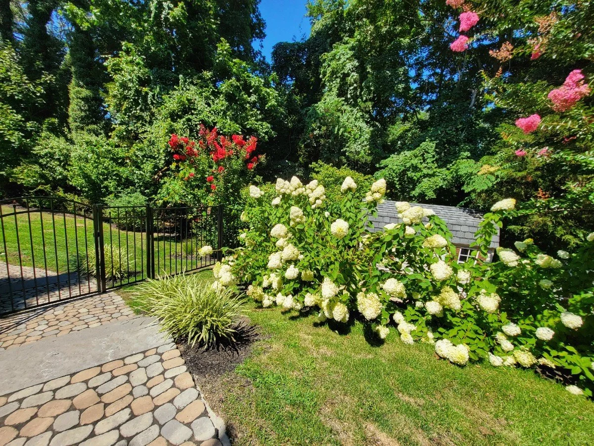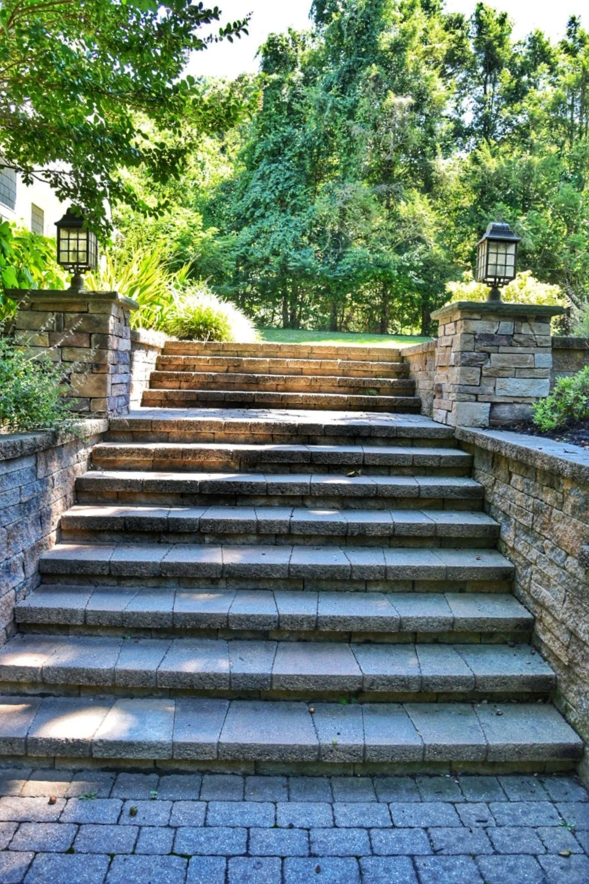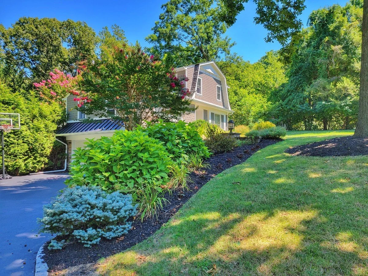 This full-landscape project included the front entrance beautification of this charming Dutch colonial home and a poolscape. Impressive natural stone veneer pillars with built-in outdoor lighting at the stairway entrance lead to the poolscape. Seating walls surround the inground pool on one side, while vibrantly green planting beds surround the other. The textured pool paver patio provides extra traction for slippery wet feet. After a swim, the raised patio area provides warmth and seating by a fire pit and a view of the pool.