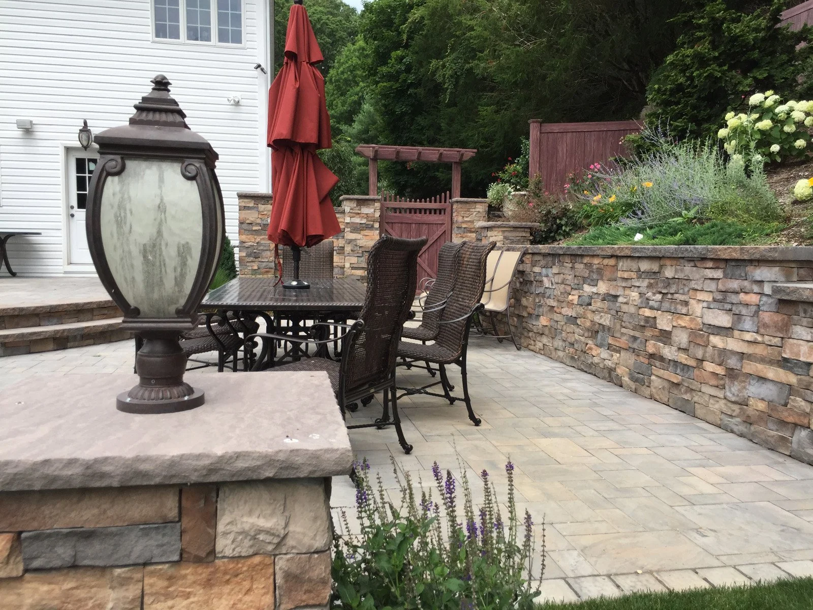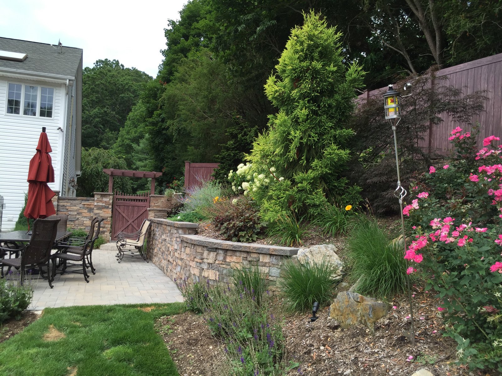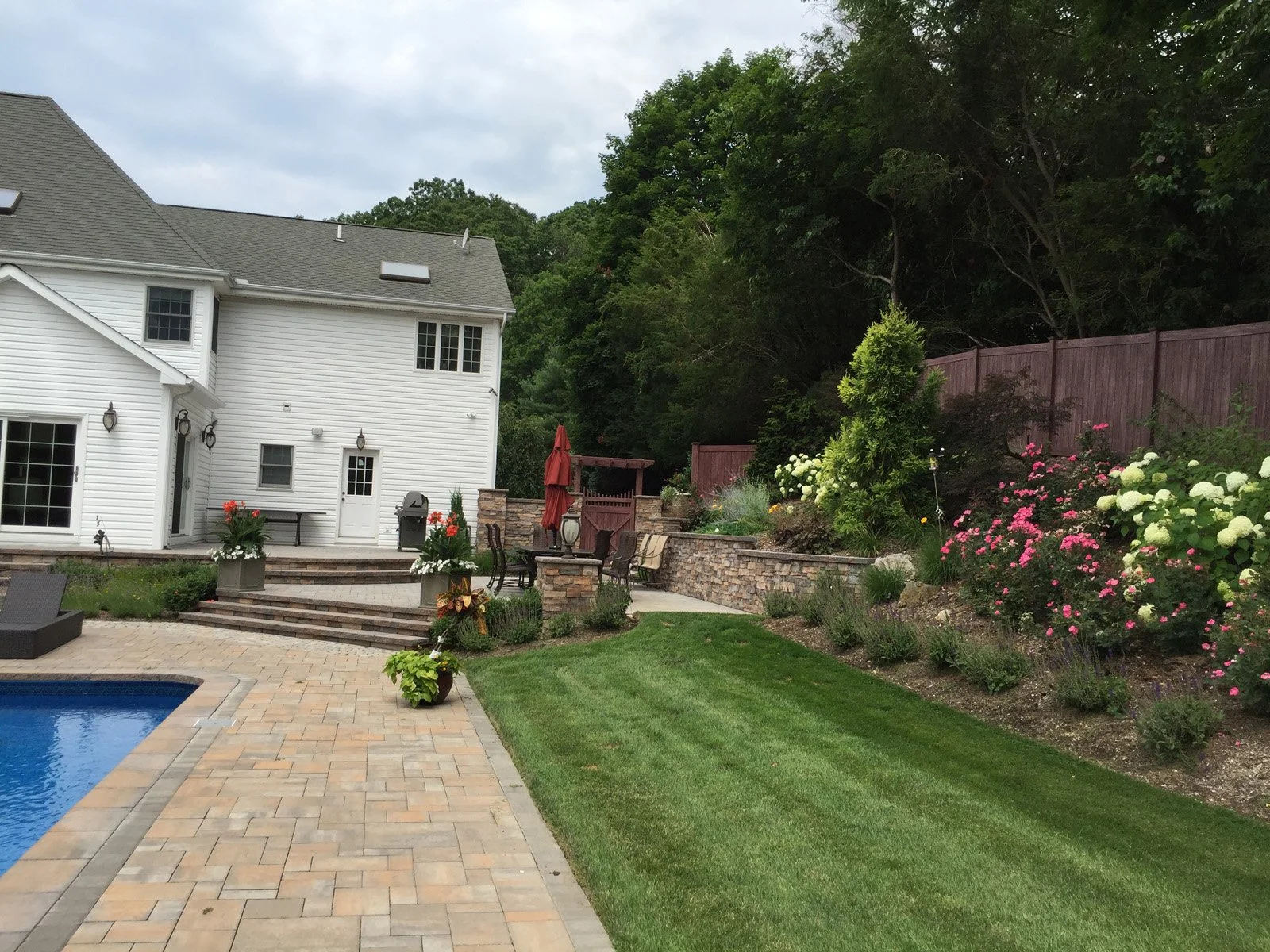 A pool and patio does not make a backyard. Gary Duff Designs first stepped onto this unkempt yard equip with a few relaxation requisites but lacking the thoughtful finishing touches needed to refine the space. In one month, Gary Duff Designs tapped into its unused potential by opening up the yard, adding an entrance and creating extra areas to sit and relax, including a shelf in the home’s new spa and a new counter at the bar. When confronted with years-old pavers, the team found a perfect replacement that protected cohesion and elevated design. By combining rich earth tones, wood grain, bronze ornamental aluminum railing and vibrant flowers throughout, the backyard was transformed into a homey escape that embraces residents and guests alike.