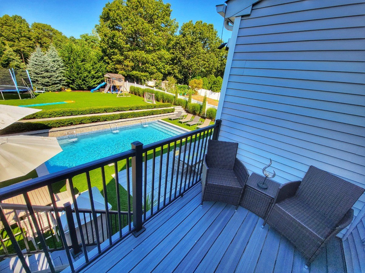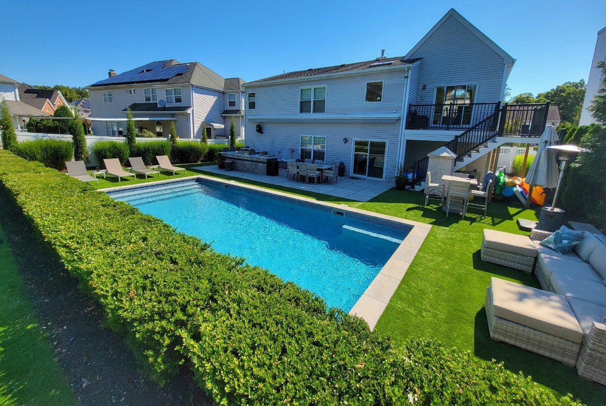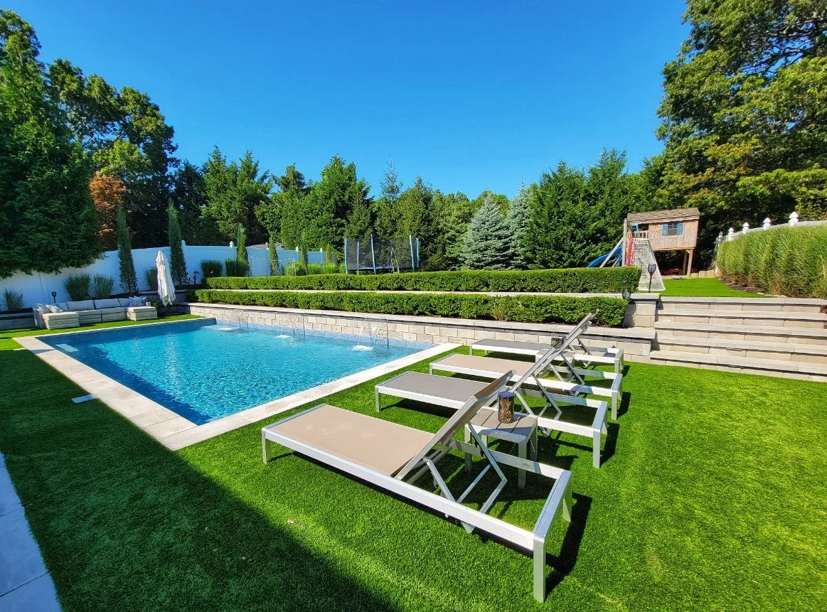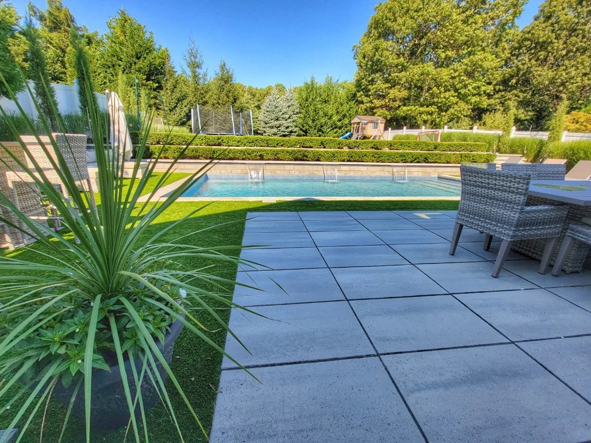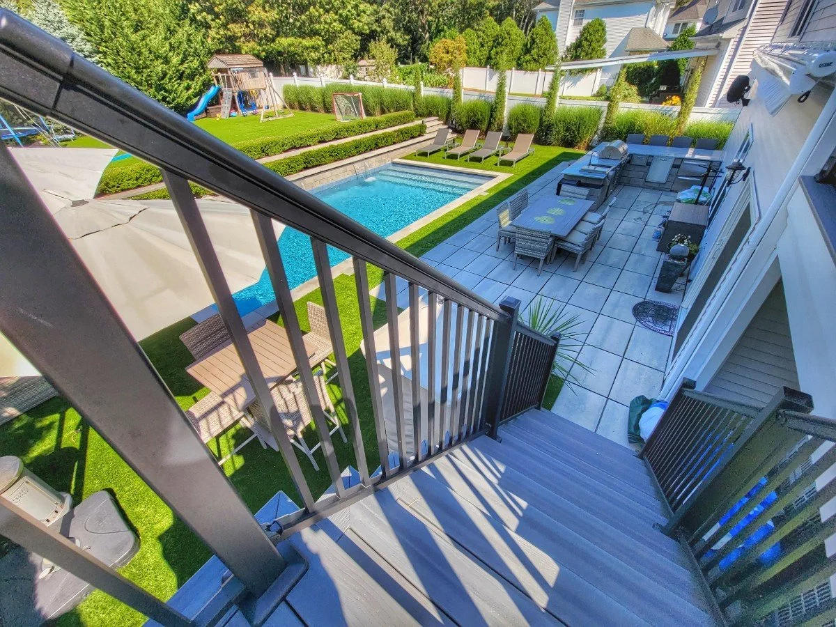 This family-friendly landscape features a beautiful inground pool with stunning waterfalls. It’s surrounded by artificial turf, for an always-clean look of a lush, green lawn without the worry of a muddy poolscape. Oversize paver patios provide the backdrop for an L-shaped outdoor kitchen and bar area, complete with state-of-the-art stainless steel appliances and an outdoor dining room table. Stairs lead to a raised deck with comfortable seating and a bird's-eye view of the entire outdoor living space. We built retaining walls to create a transition between the poolscape area and the backyard play area. Hedges fill the planting beds along the retaining wall, and stairs connect the two living areas. A staggered paver walkway around the side of the home leads to the paver driveway and front entrance.
