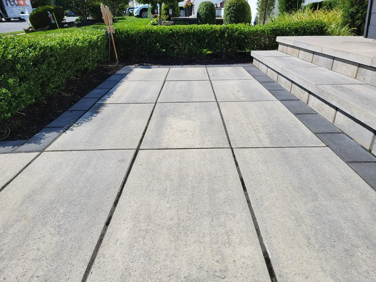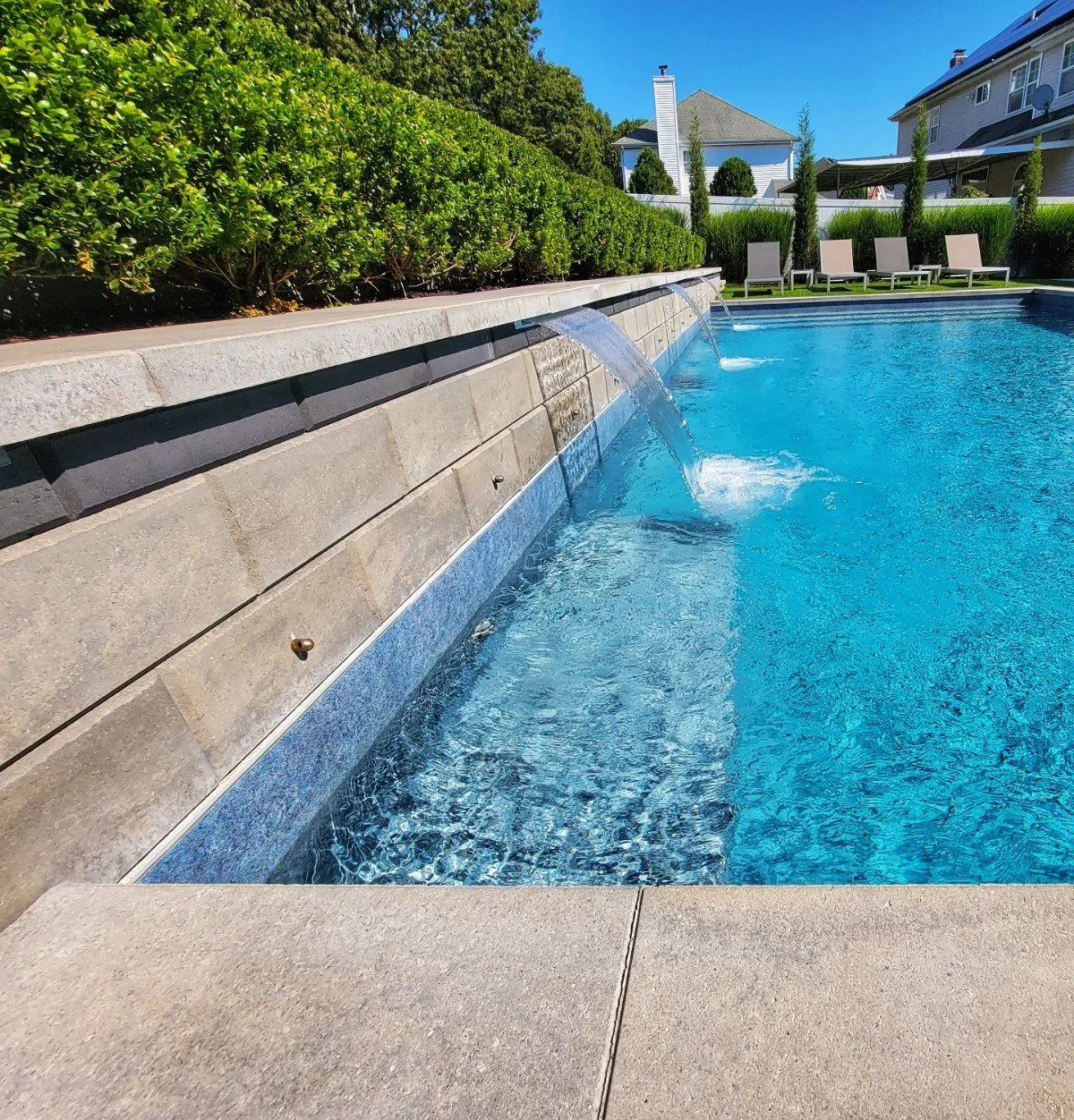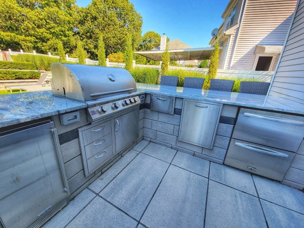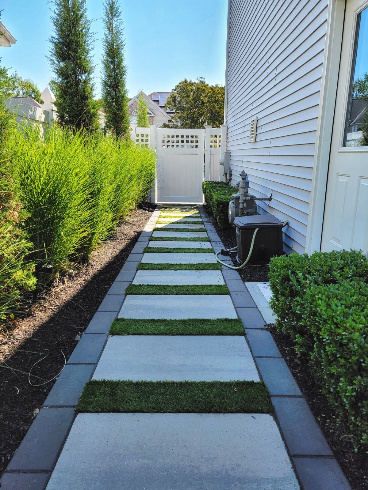 This family-friendly landscape features a beautiful inground pool with stunning waterfalls. It’s surrounded by artificial turf, for an always-clean look of a lush, green lawn without the worry of a muddy poolscape. Oversize paver patios provide the backdrop for an L-shaped outdoor kitchen and bar area, complete with state-of-the-art stainless steel appliances and an outdoor dining room table. Stairs lead to a raised deck with comfortable seating and a bird's-eye view of the entire outdoor living space. We built retaining walls to create a transition between the poolscape area and the backyard play area. Hedges fill the planting beds along the retaining wall, and stairs connect the two living areas. A staggered paver walkway around the side of the home leads to the paver driveway and front entrance.
