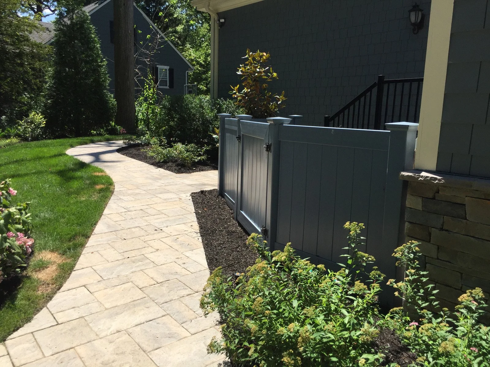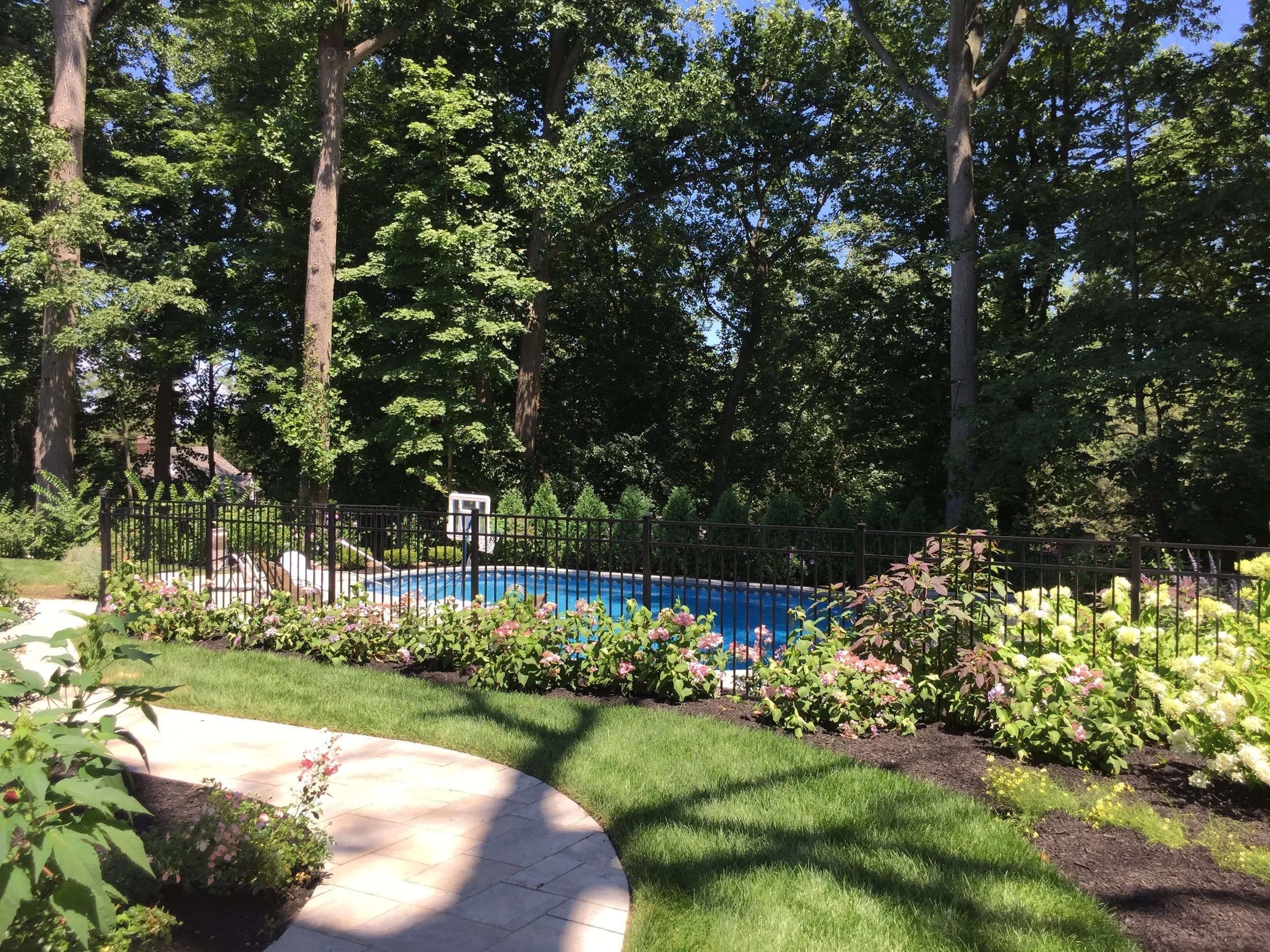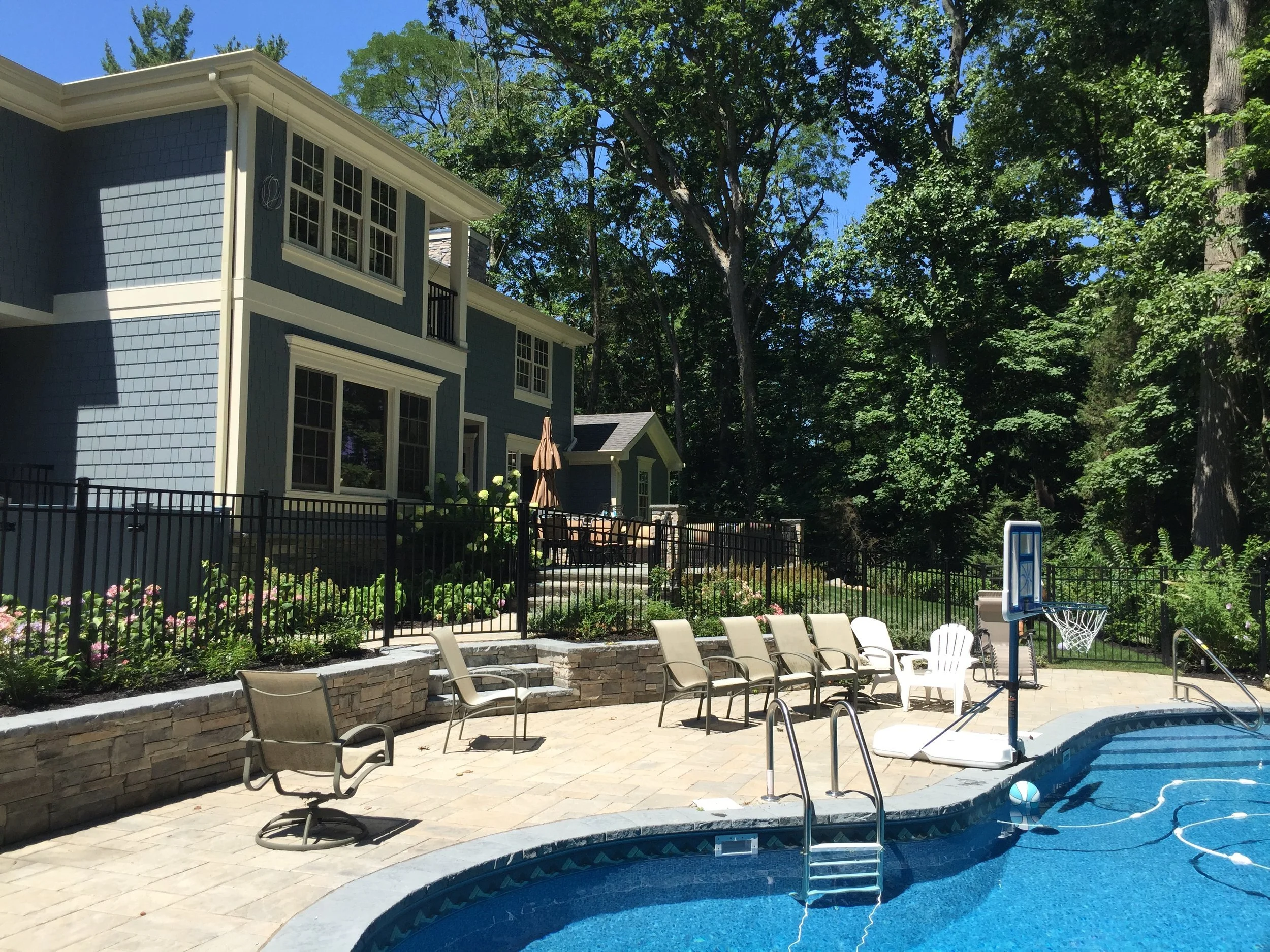 Gary Duff Designs transformed this tiny hilltop hangout into a spacious, safe and state-of-the-art aquatic retreat. A new swimming pool was installed with an adjacent hot tub – the two connected by a sheer descent waterfall. In order to address concerns over erosion and drainage, the team built a secure boulder retaining wall on the back-end of the property to help shore up the ground. Calming, chic grey tones were used on the pool patios and walkways in order to match the blue siding of the home.