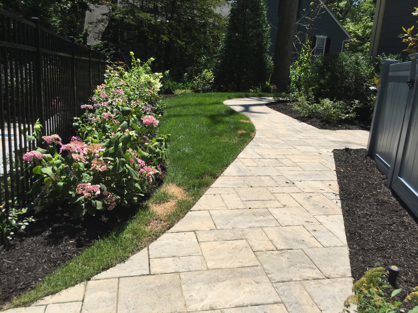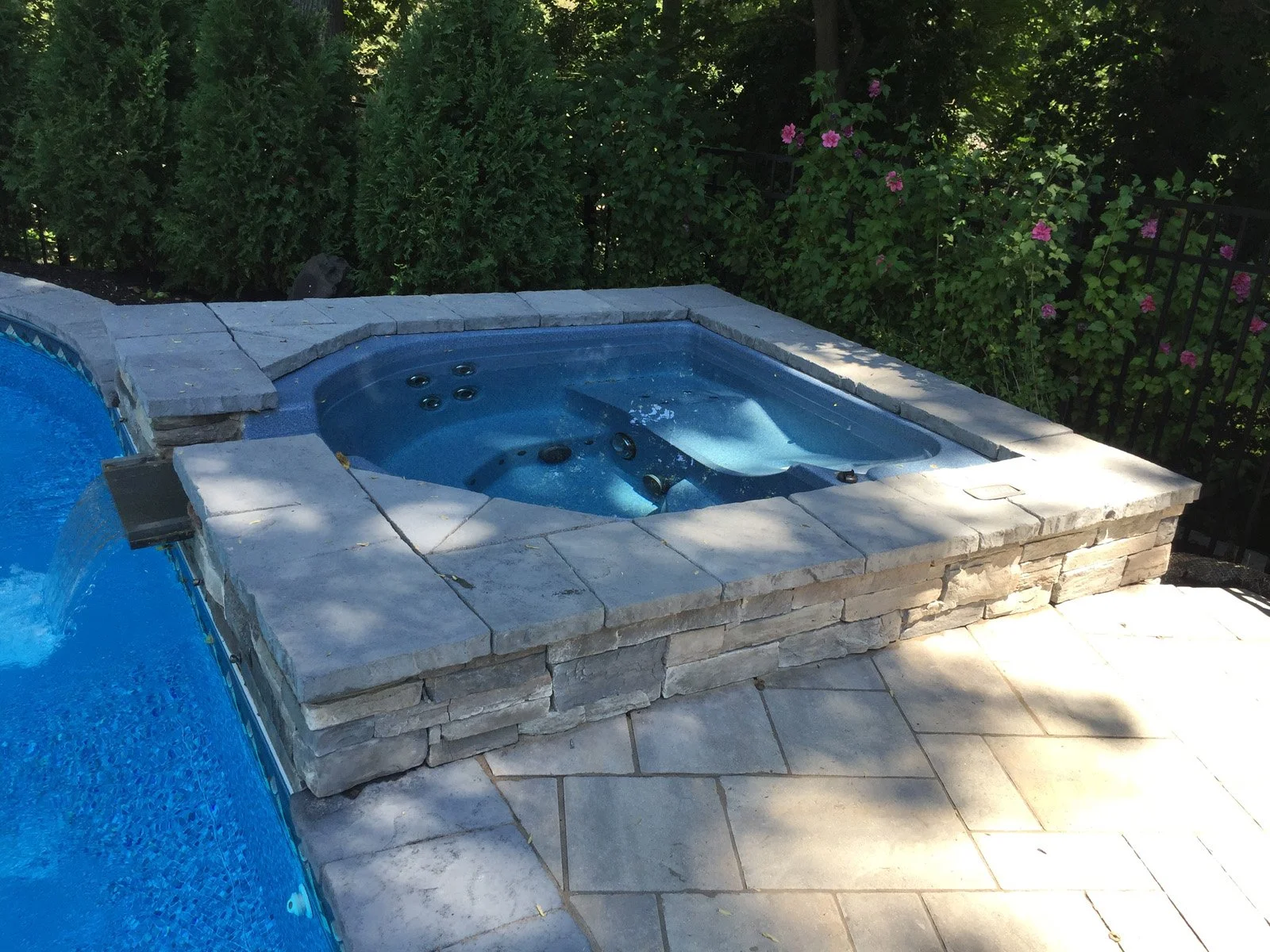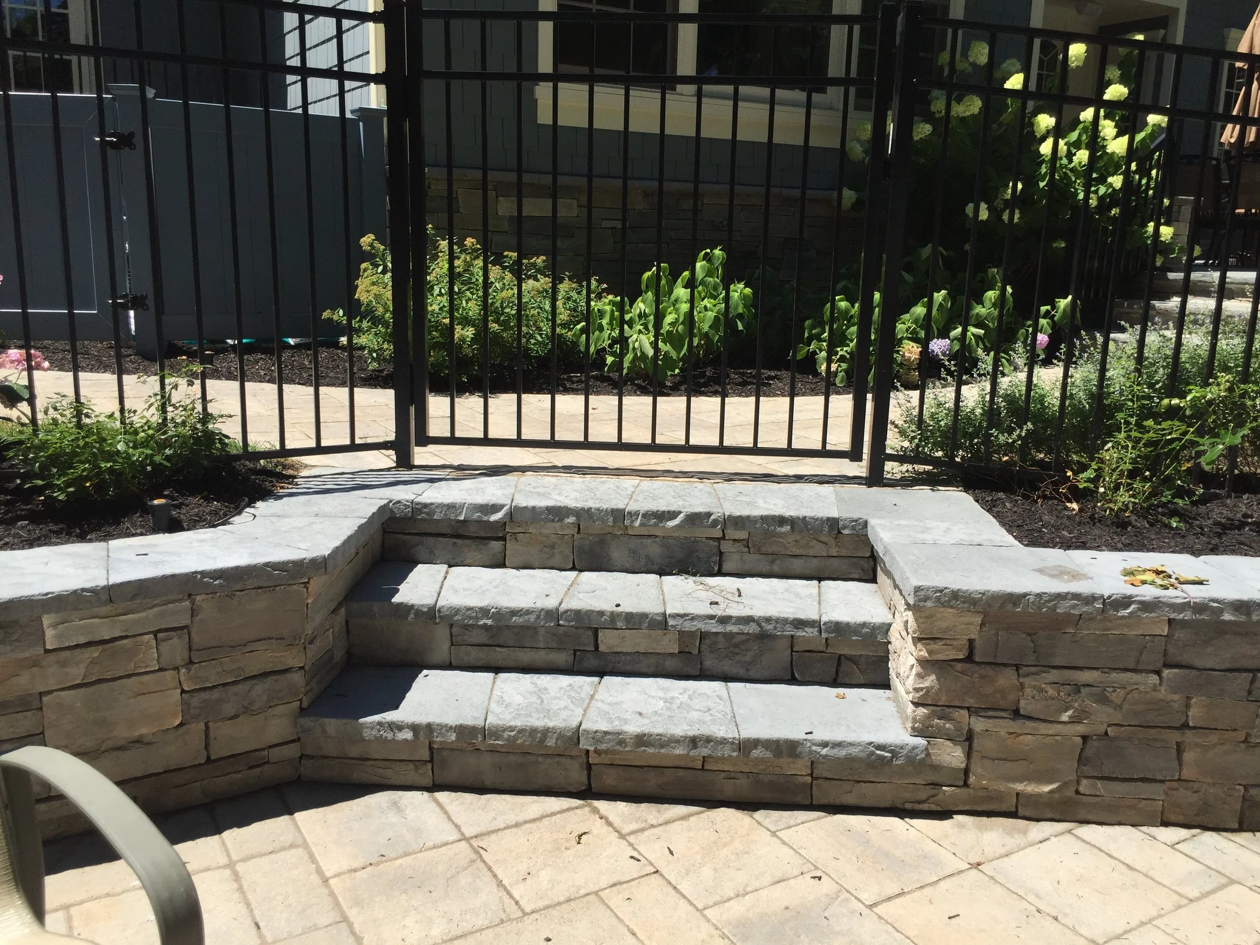 Gary Duff Designs transformed this tiny hilltop hangout into a spacious, safe and state-of-the-art aquatic retreat. A new swimming pool was installed with an adjacent hot tub – the two connected by a sheer descent waterfall. In order to address concerns over erosion and drainage, the team built a secure boulder retaining wall on the back-end of the property to help shore up the ground. Calming, chic grey tones were used on the pool patios and walkways in order to match the blue siding of the home.