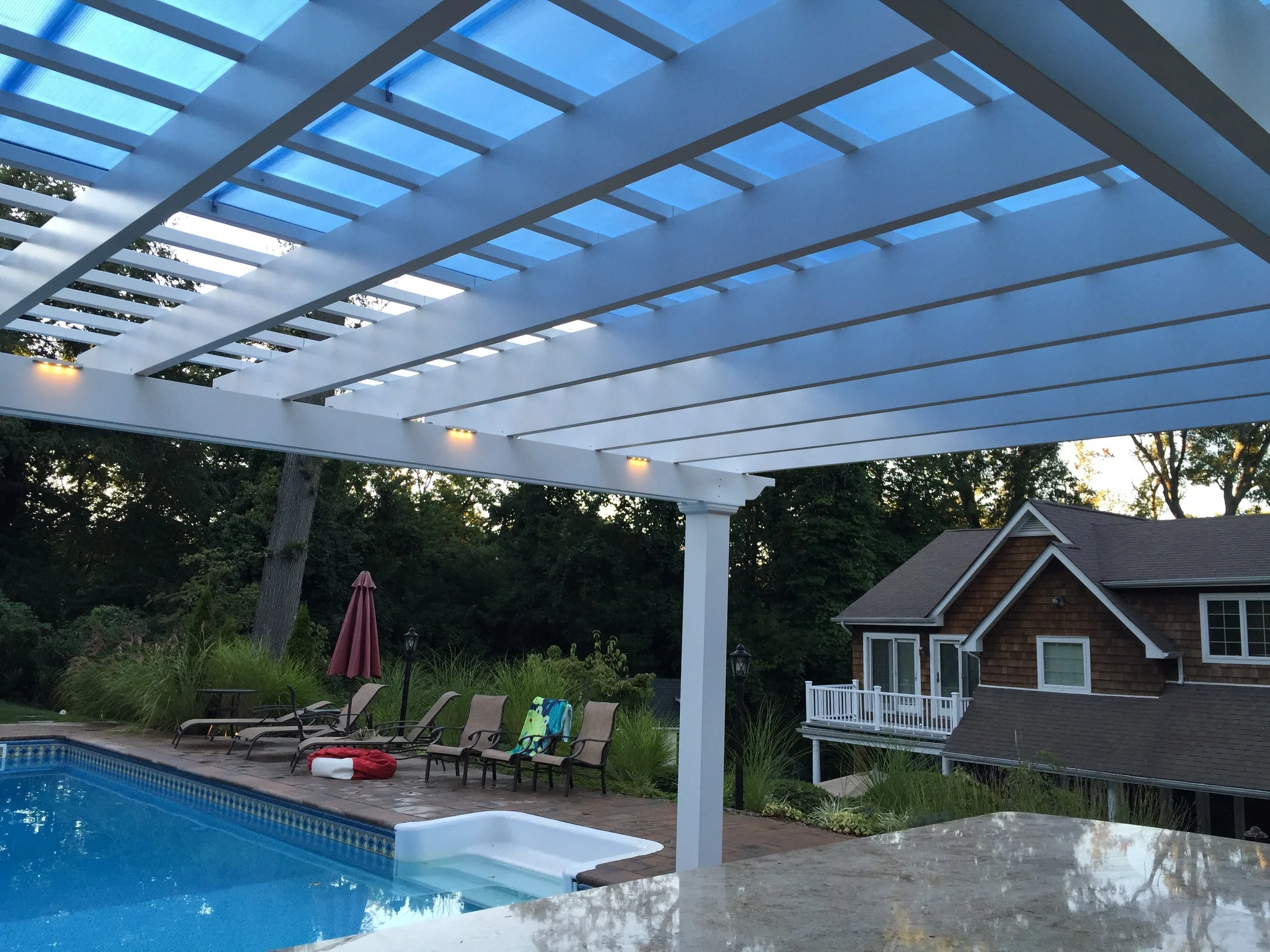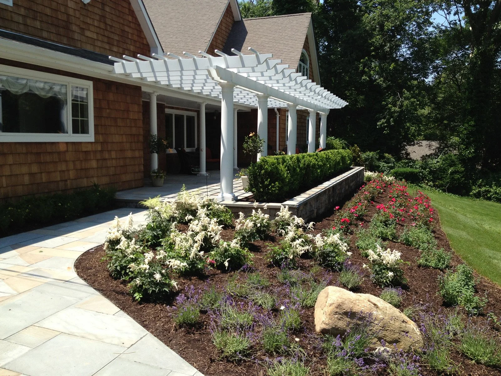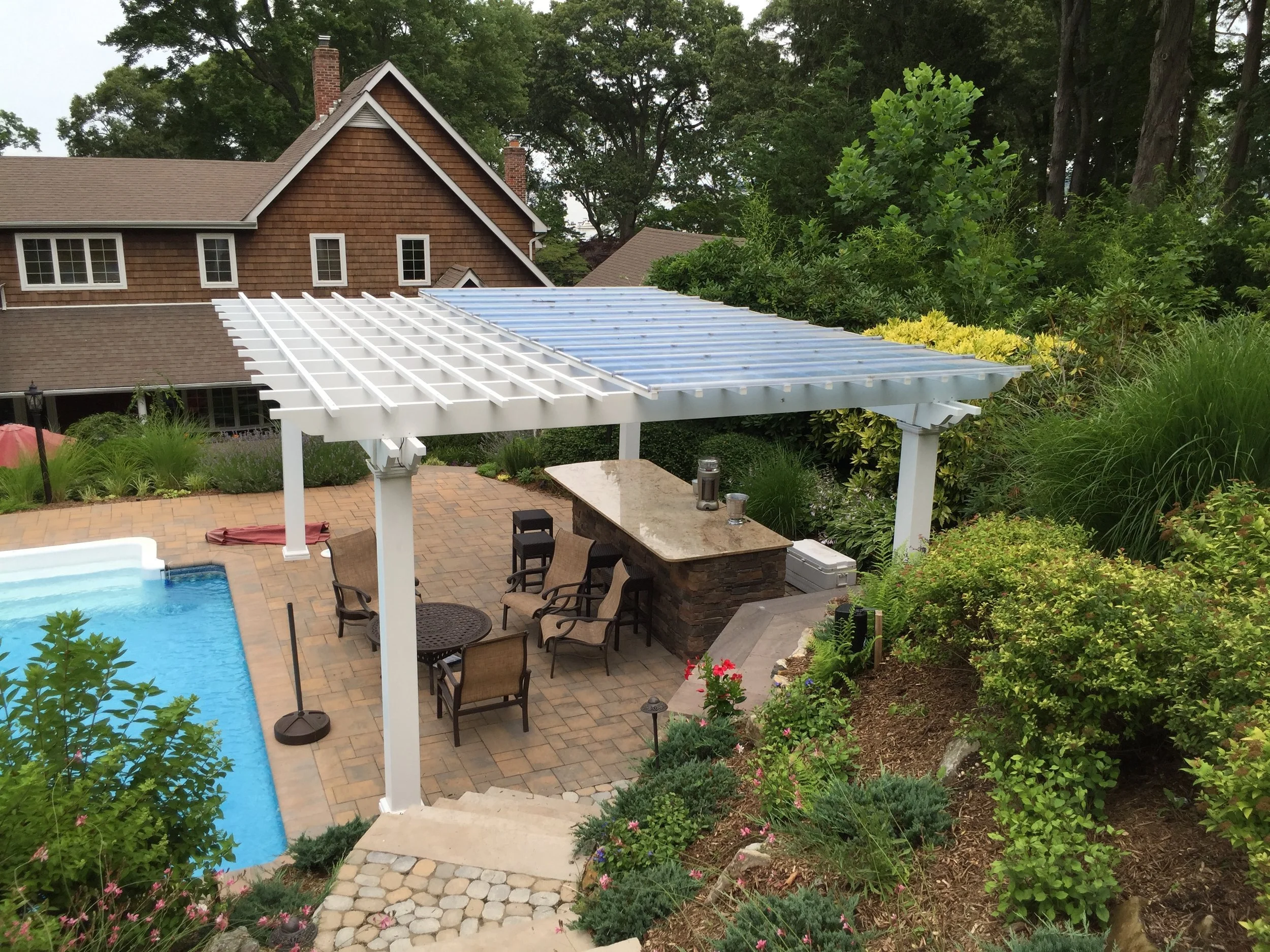 A blasé pool and a buckling patio were the first things to go during this four-week Gary Duff Designs makeover. By redoing the patio flooring and installing a cascading waterfall (one of two on the property), the space immediately transitioned into a tranquil area to sit or float – but always relax. One of the most significant changes was the addition of a pergola off the front of the house. This architectural design element added effortless elegance. Final finishing touches included rebuilding the steps and replanting the front and backyards with lower growing, more colorful foliage.