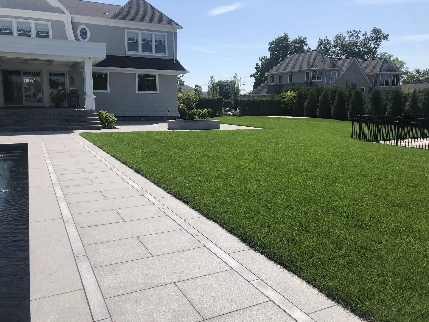 Gary Duff Designs paired a contemporary, geometric look with a traditional seaside home to showcase its unique harbor location and spacious property in Babylon, NY. Throughout the pool and deck area, the modern, no-frills appearance keeps your focus on passing boats and the serene harbor views. The design continues a geometric style for the pavers in and around the pool and through a large, rectangular fire pit. Overall the visual palette accents and highlights the home’s blue, white, and grey colors.