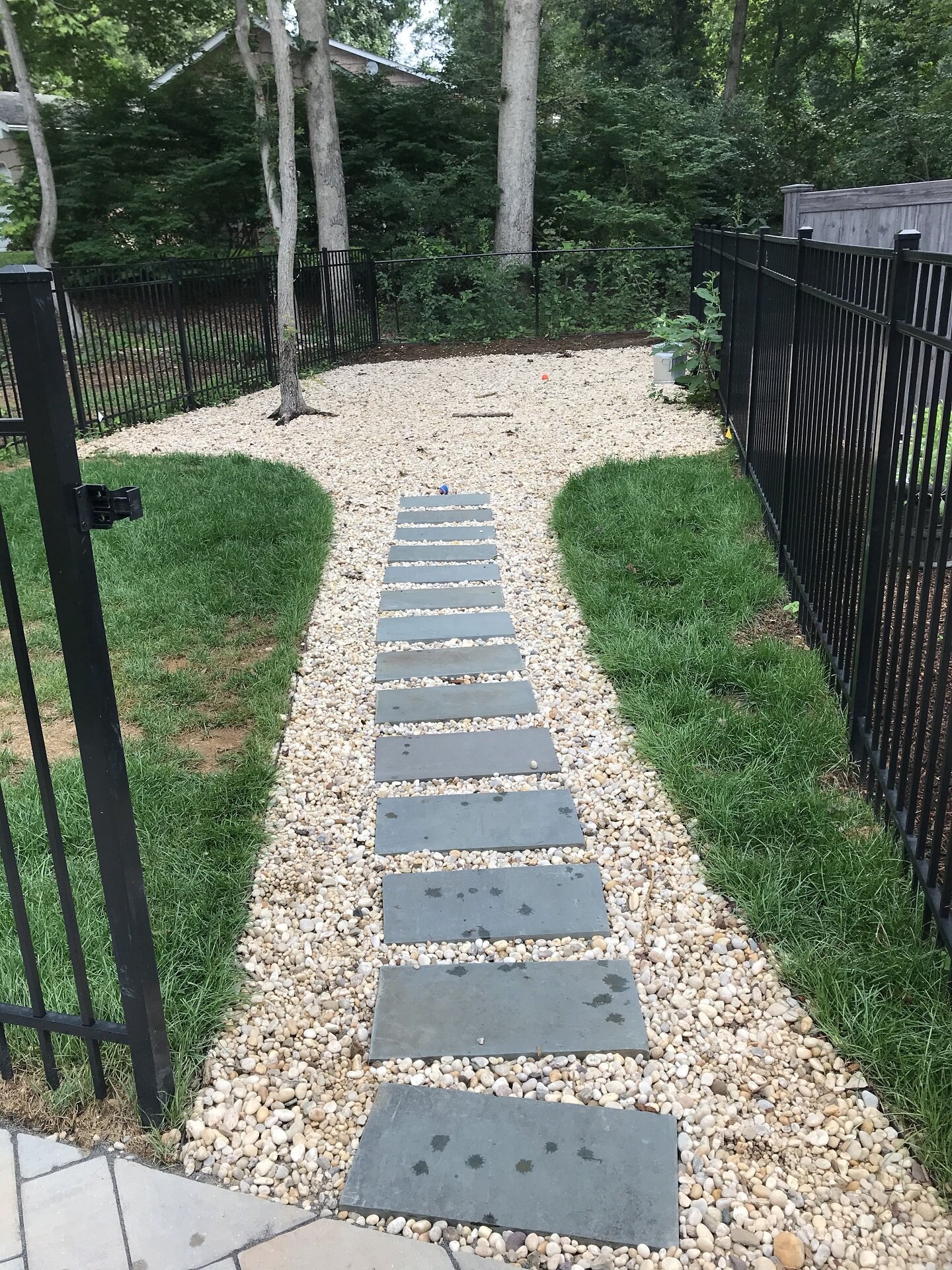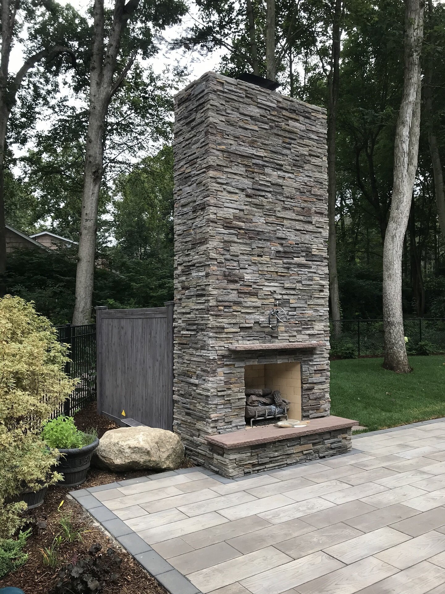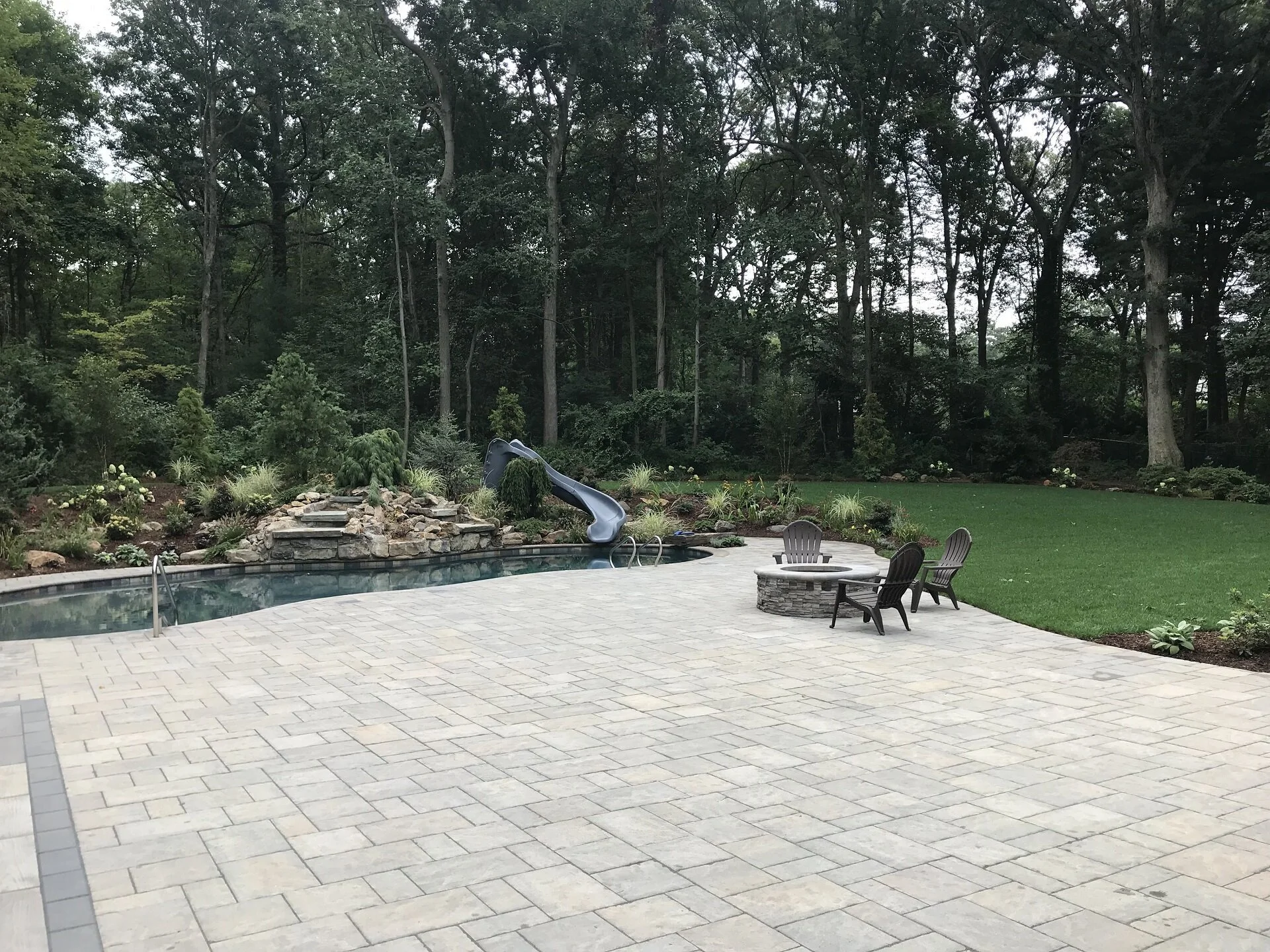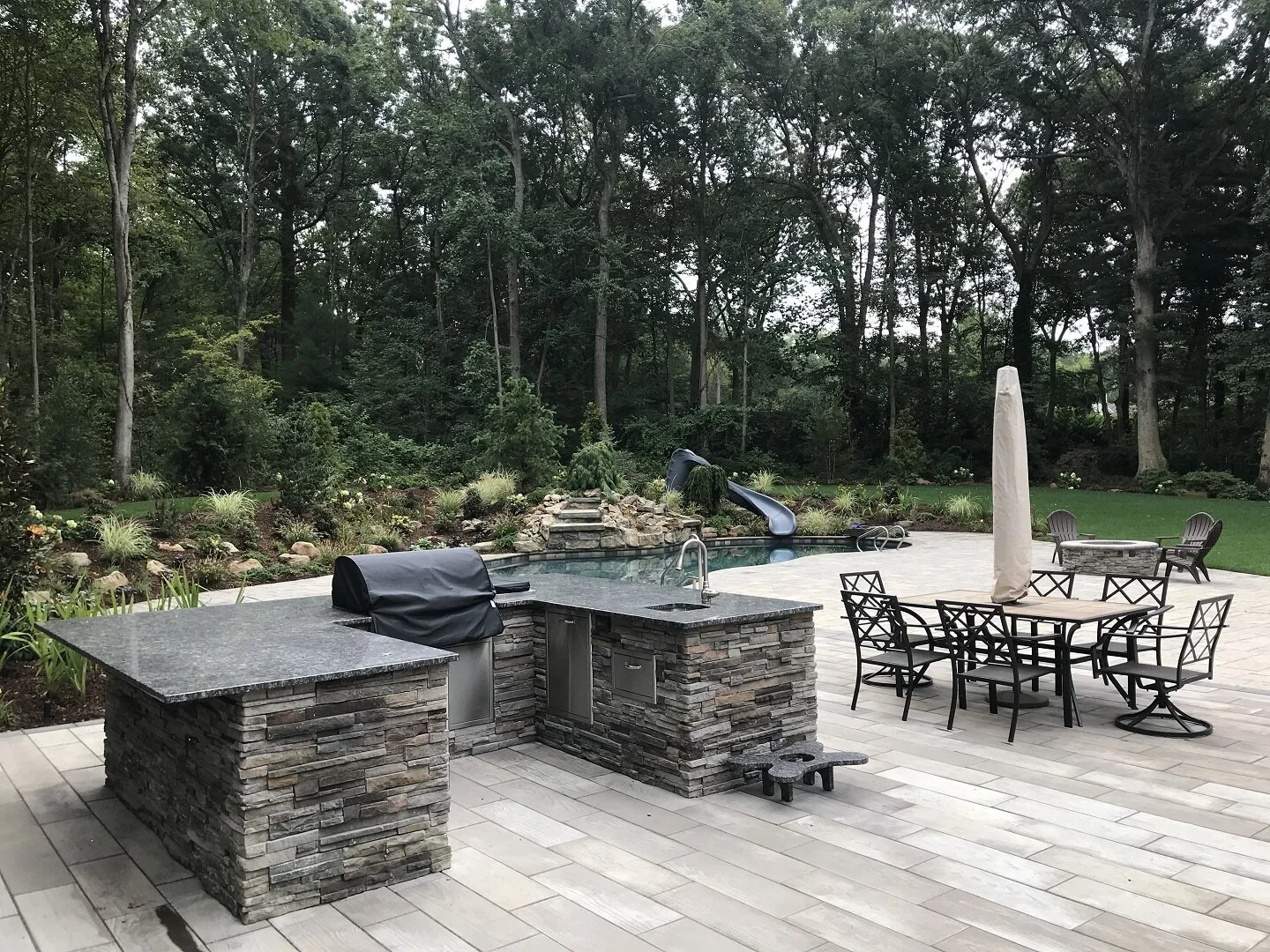 Nestled in the Dix Hills, New York woods, this serene backyard pool retreat, designed and built by Gary Duff Designs seamlessly combines natural and man-made features. We designed the pool to be the main focus and built a curving patio and seating area around it. The pool looks like it’s always belonged. The light-color rectangular pavers gave the entire area the look and feel of a wooden deck, with the versatility and durability of concrete pavers. They also helped to lighten up the area. An outdoor kitchen provides the homeowners room to entertain while preparing and serving a full meal from the grill, cooktop, mini-fridge, and wine cooler. In a separate corner, we added a dramatic, tall fireplace, designed to eventually support a cabana, to create a cozy place for guests to congregate. Nearby, a pea gravel dog run helps an elderly best friend get around much easier. The slide, integrated into the plantings, blends into the natural surrounding while still adding an element for children.