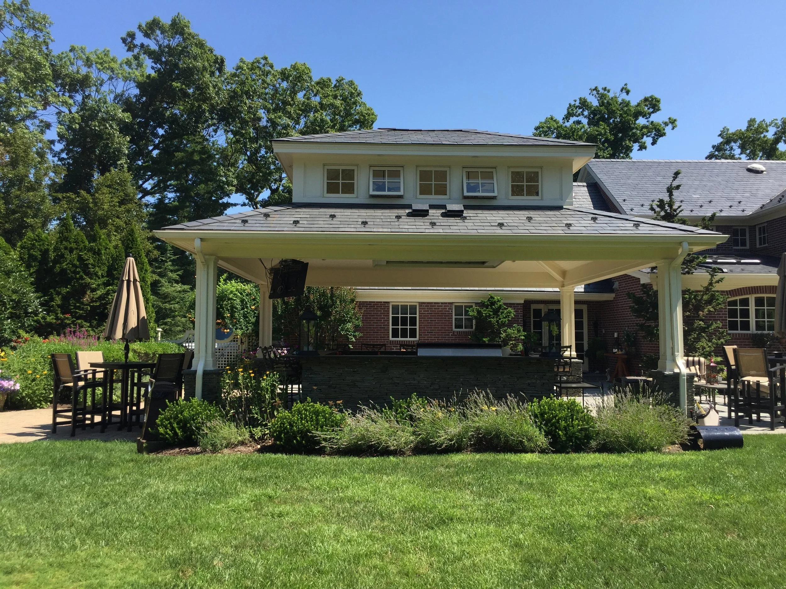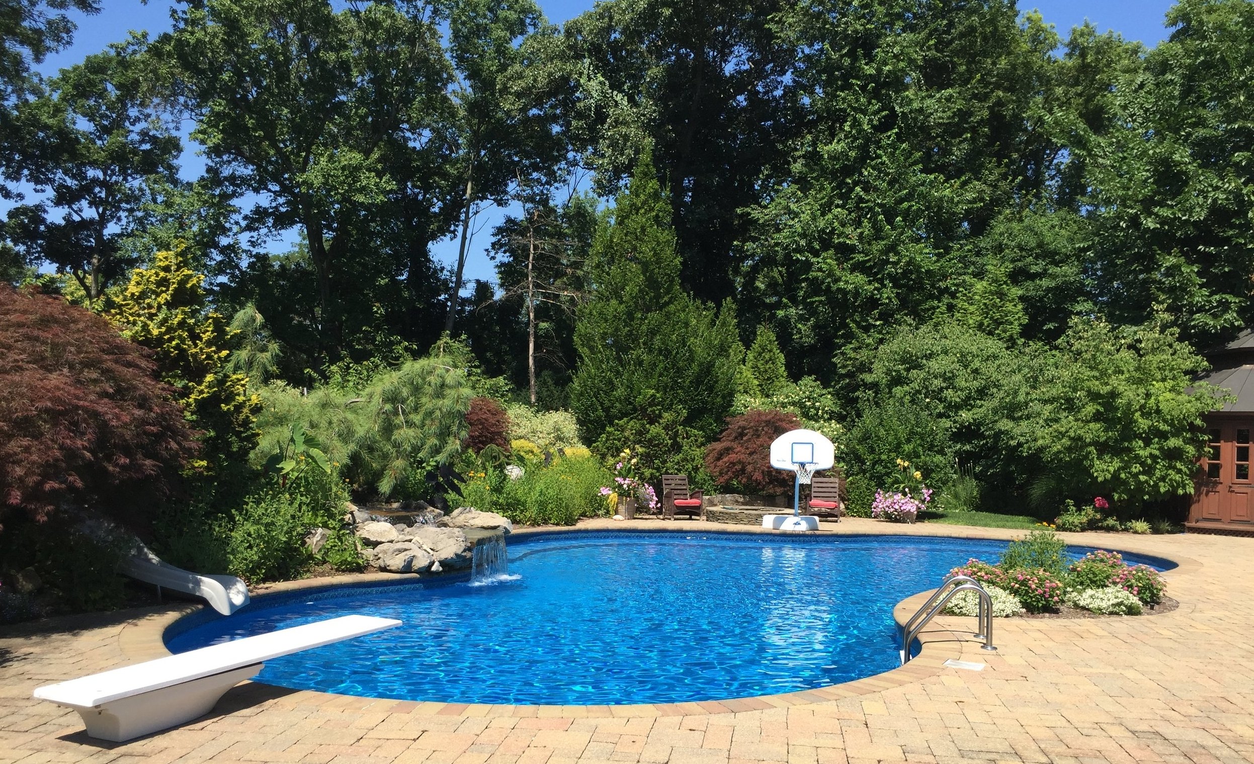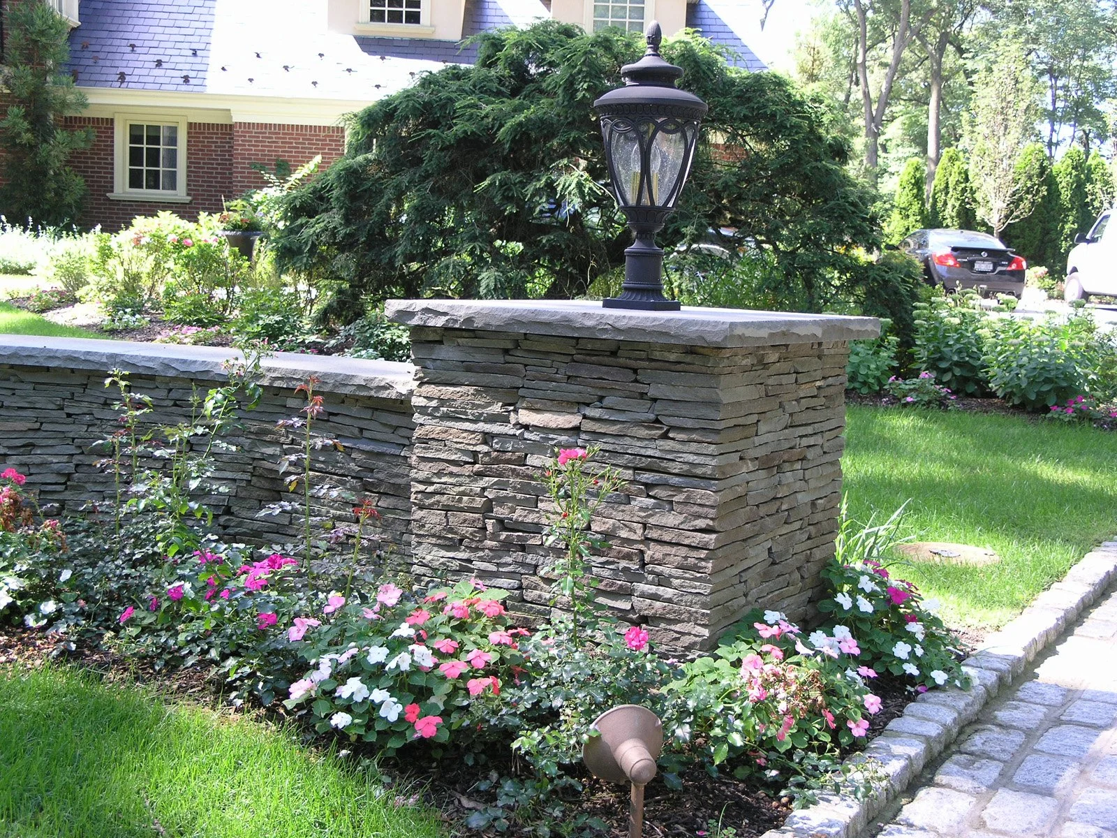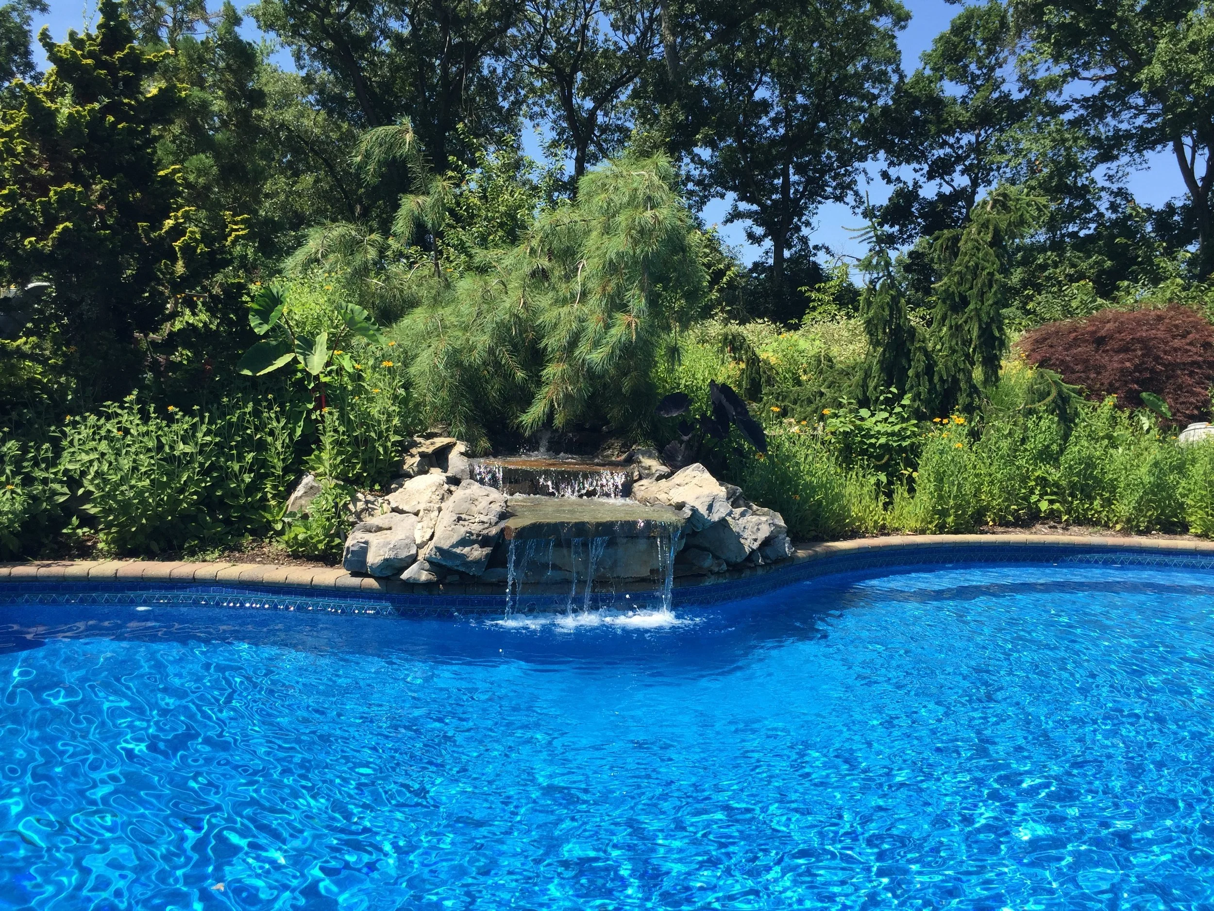 Inspired by the classic brick home, Gary Duff Designs used natural and timeless elements in this landscape design. Starting at the front entrance and driveway, visitors are welcomed with stacked bluestone decorative retaining walls, Belgian block curbing and inlays, and bluestone walkways. The same bluestone is used in some of the patios along with Unilock Stonehenge Coffee Creek. In the swimming pool area, the first waterfall is incorporated into the pool with a fire feature built on top of it. Nearby, the functional fire pit provides a gathering place in the evenings. Away from this main space, a discreet outdoor spa and a separate waterfall retreat area offer secluded spaces. As the finishing touch, all of the plantings were chosen for privacy and their naturalistic character.