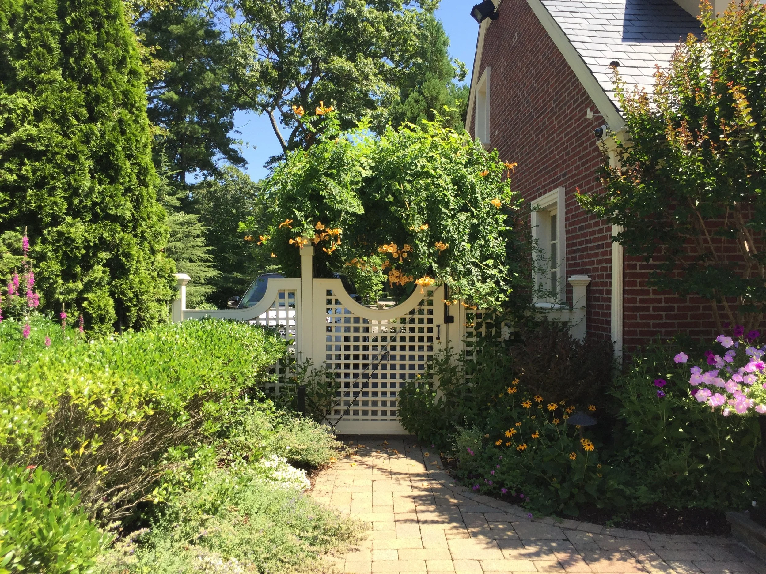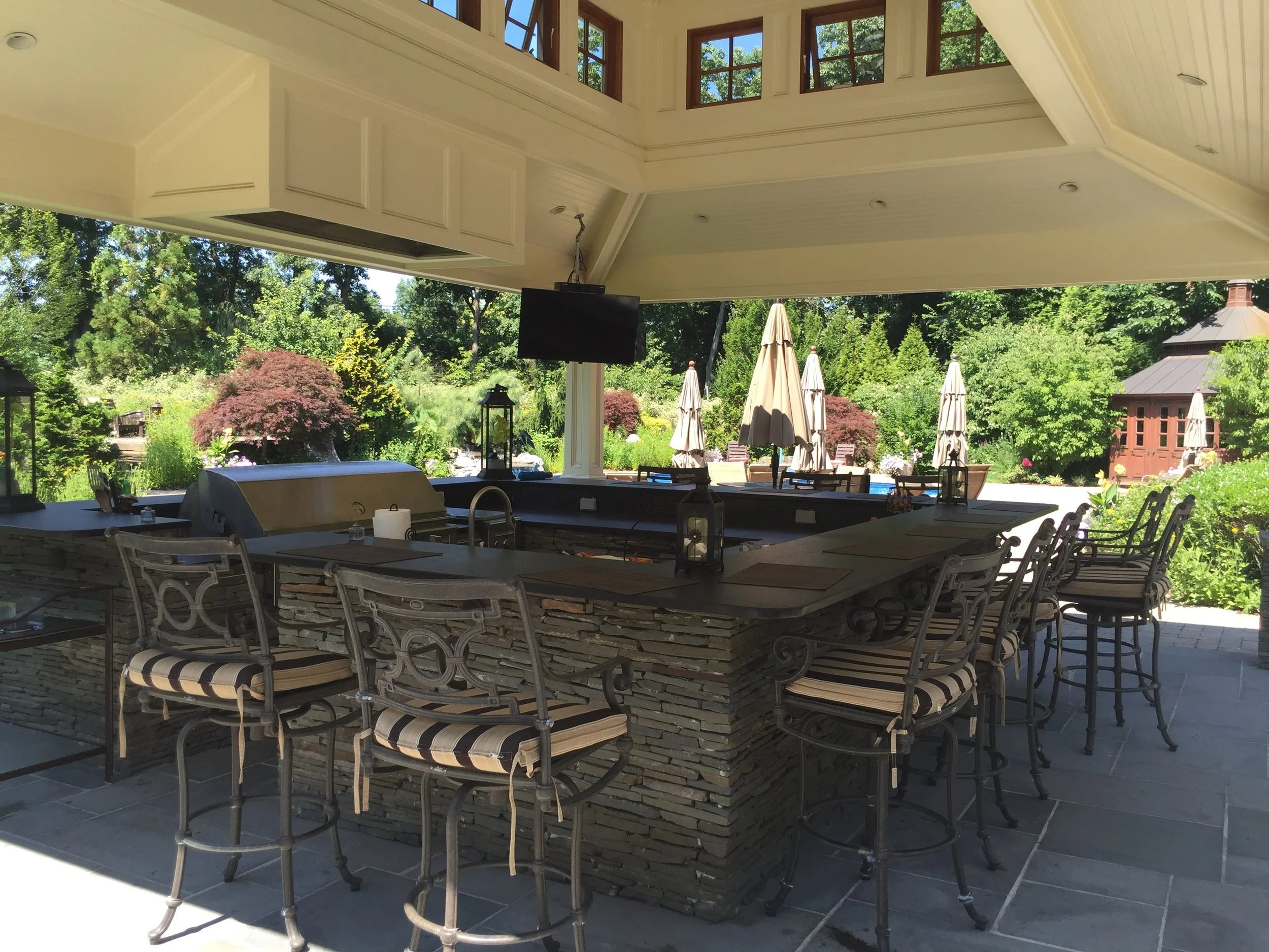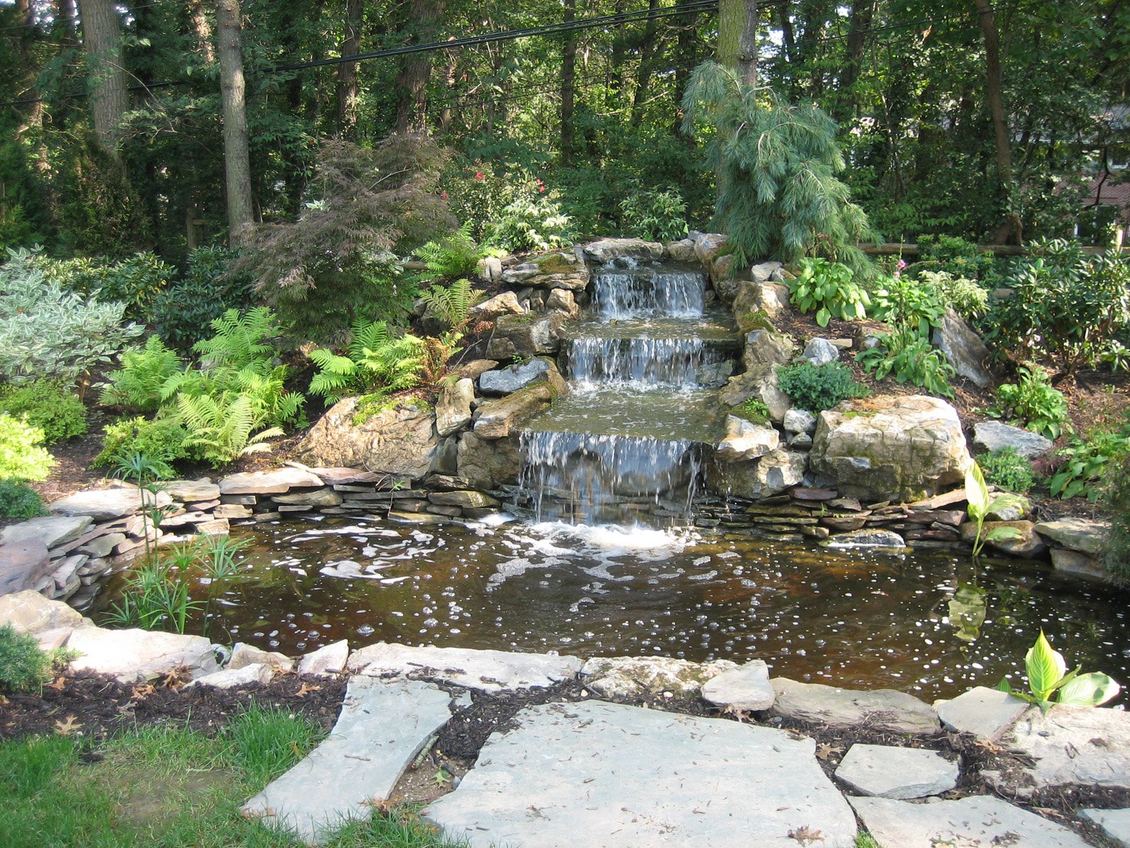 Inspired by the classic brick home, Gary Duff Designs used natural and timeless elements in this landscape design. Starting at the front entrance and driveway, visitors are welcomed with stacked bluestone decorative retaining walls, Belgian block curbing and inlays, and bluestone walkways. The same bluestone is used in some of the patios along with Unilock Stonehenge Coffee Creek. In the swimming pool area, the first waterfall is incorporated into the pool with a fire feature built on top of it. Nearby, the functional fire pit provides a gathering place in the evenings. Away from this main space, a discreet outdoor spa and a separate waterfall retreat area offer secluded spaces. As the finishing touch, all of the plantings were chosen for privacy and their naturalistic character.
