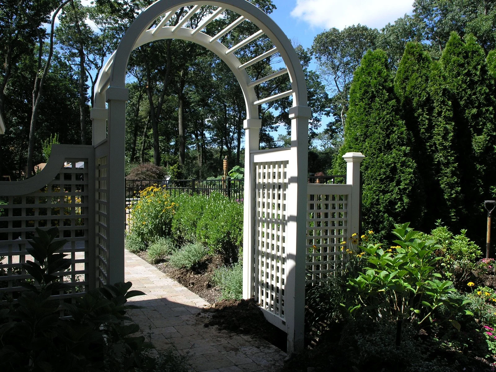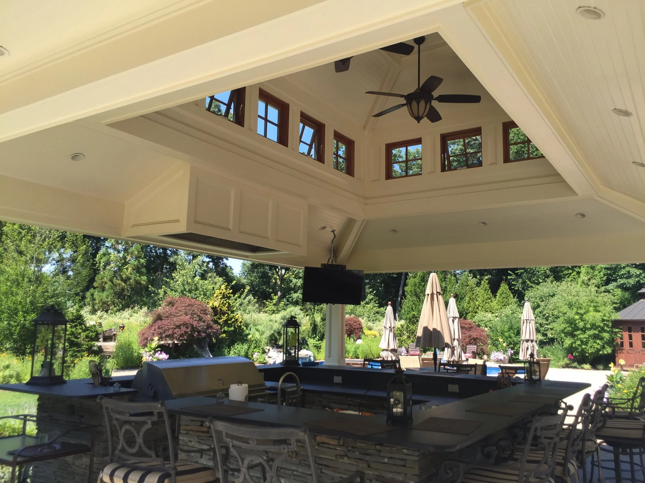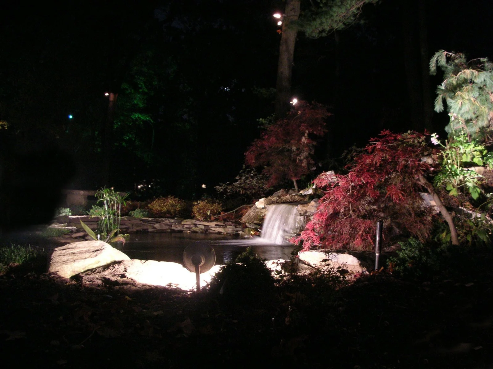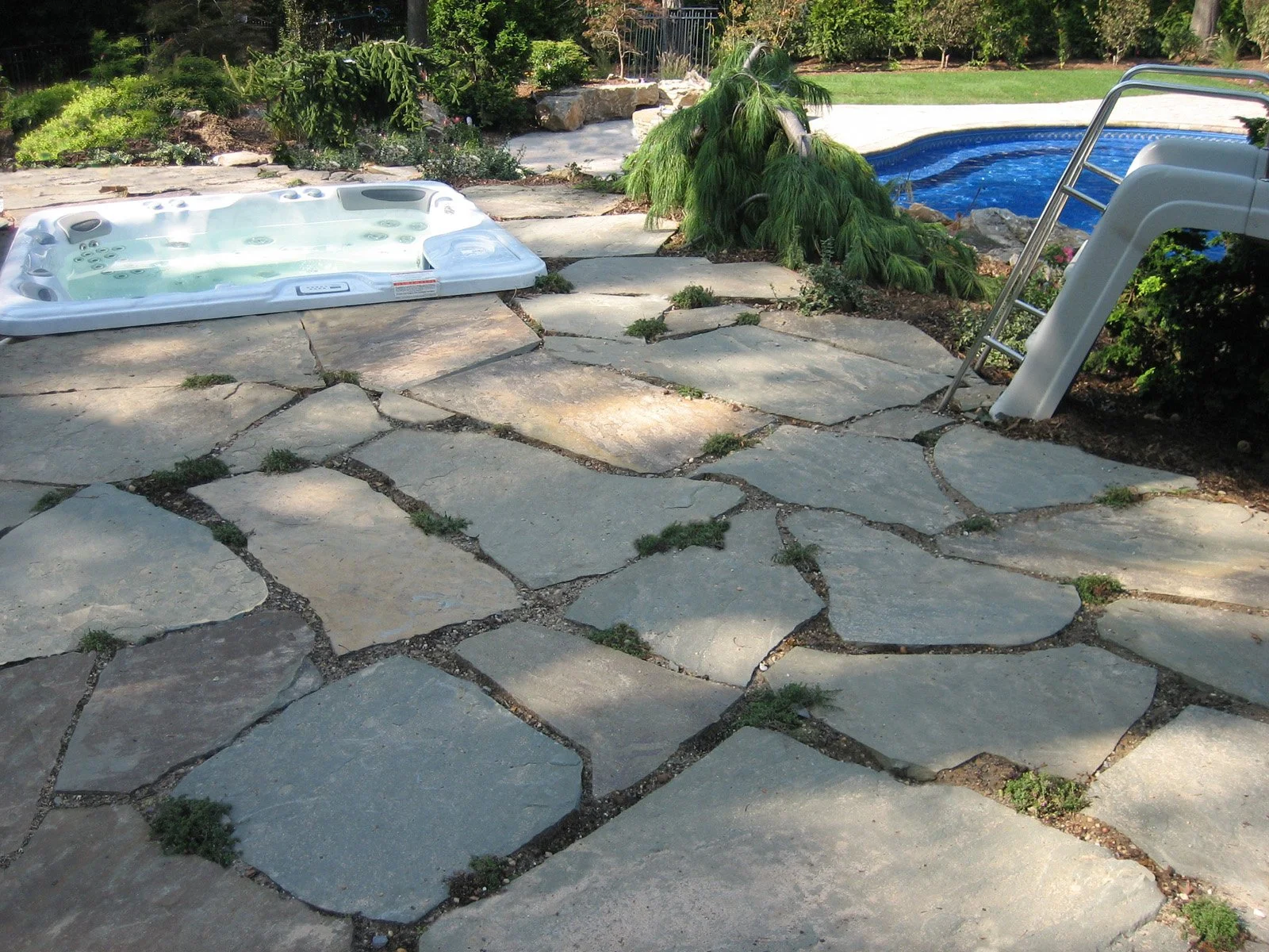 Inspired by the classic brick home, Gary Duff Designs used natural and timeless elements in this landscape design. Starting at the front entrance and driveway, visitors are welcomed with stacked bluestone decorative retaining walls, Belgian block curbing and inlays, and bluestone walkways. The same bluestone is used in some of the patios along with Unilock Stonehenge Coffee Creek. In the swimming pool area, the first waterfall is incorporated into the pool with a fire feature built on top of it. Nearby, the functional fire pit provides a gathering place in the evenings. Away from this main space, a discreet outdoor spa and a separate waterfall retreat area offer secluded spaces. As the finishing touch, all of the plantings were chosen for privacy and their naturalistic character.